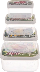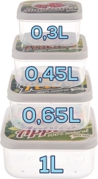 Recipientele sunt fabricate din plastic de calitate, sigur pentru contactul cu alimentele, rezistent și totodată ușor. Datorită capacului cu clips fiabil ajută la păstrarea prospețimii gustărilor, salatelor și resturilor de la cină. După utilizare pot fi introduse unul în altul, astfel economisesc spațiu în dulapul de bucătărie.