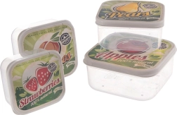 Setul conține 4 caserole pentru alimente cu volume de 900 ml, 600 ml, 400 ml și 250 ml. Forma pătrată economisește spațiu în frigider și în geantă, iar pereții transparenți facilitează identificarea rapidă. Capacele colorate cu motive de măr, pară, piersică și căpșună oferă bucătăriei un aer retro stilat.