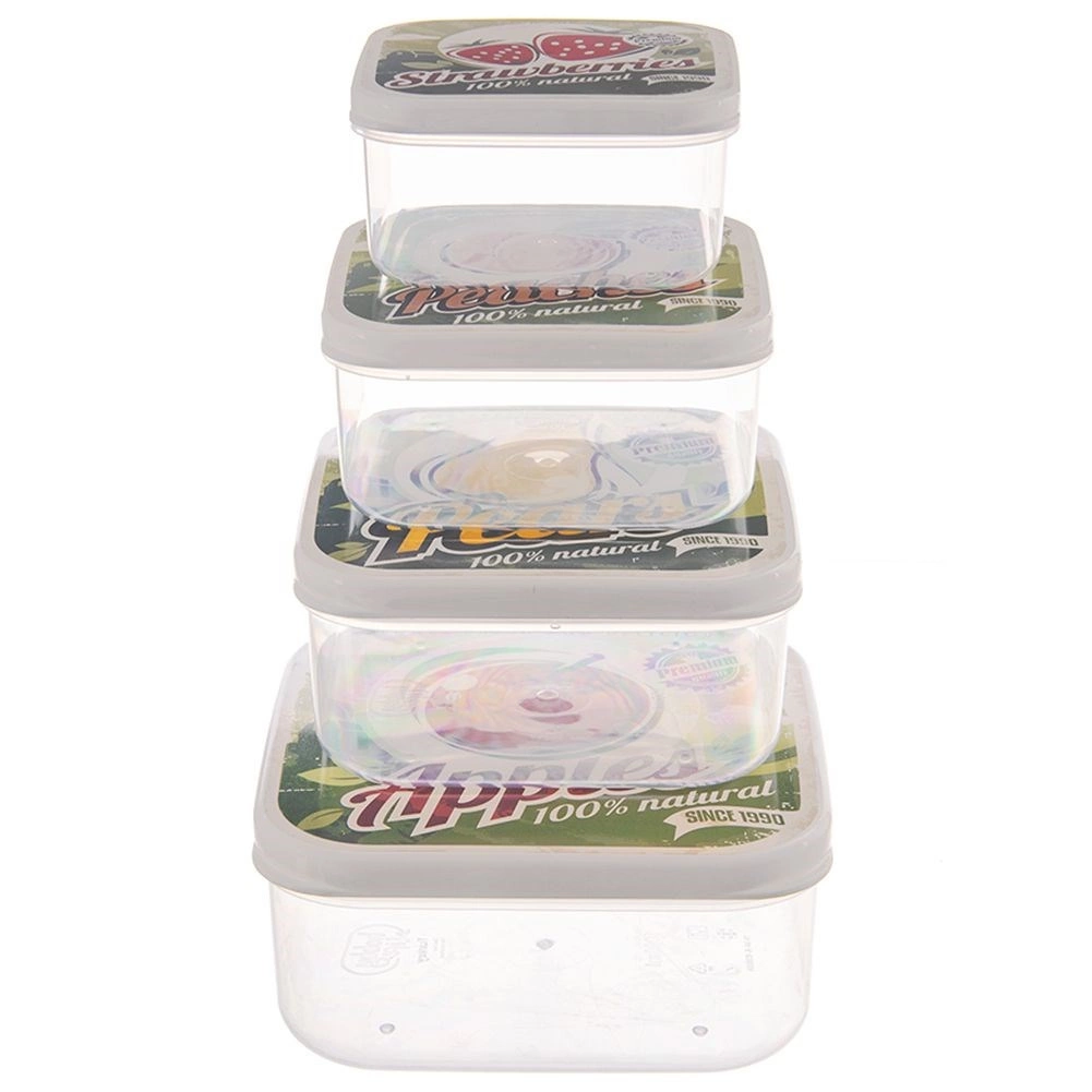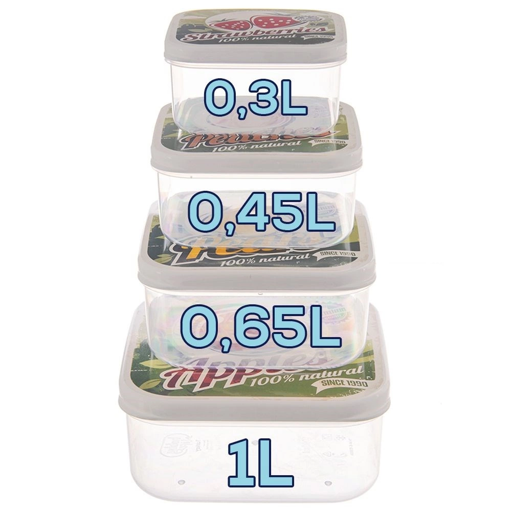 Set practic de patru caserole pătrate pentru alimente, în dimensiuni diferite, pentru utilizare zilnică. Datorită corpului transparent vei avea mereu conținutul sub control, iar capacele cu motiv retro cu fructe etanșează ferm. Recipientele sunt rezistente, ușoare, stivuibile și potrivite pentru păstrarea și transportul mâncării în frigider, la școală sau în călătorii.