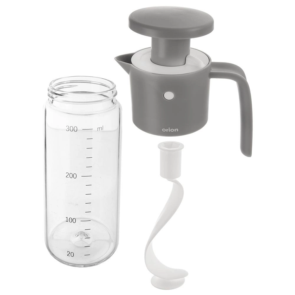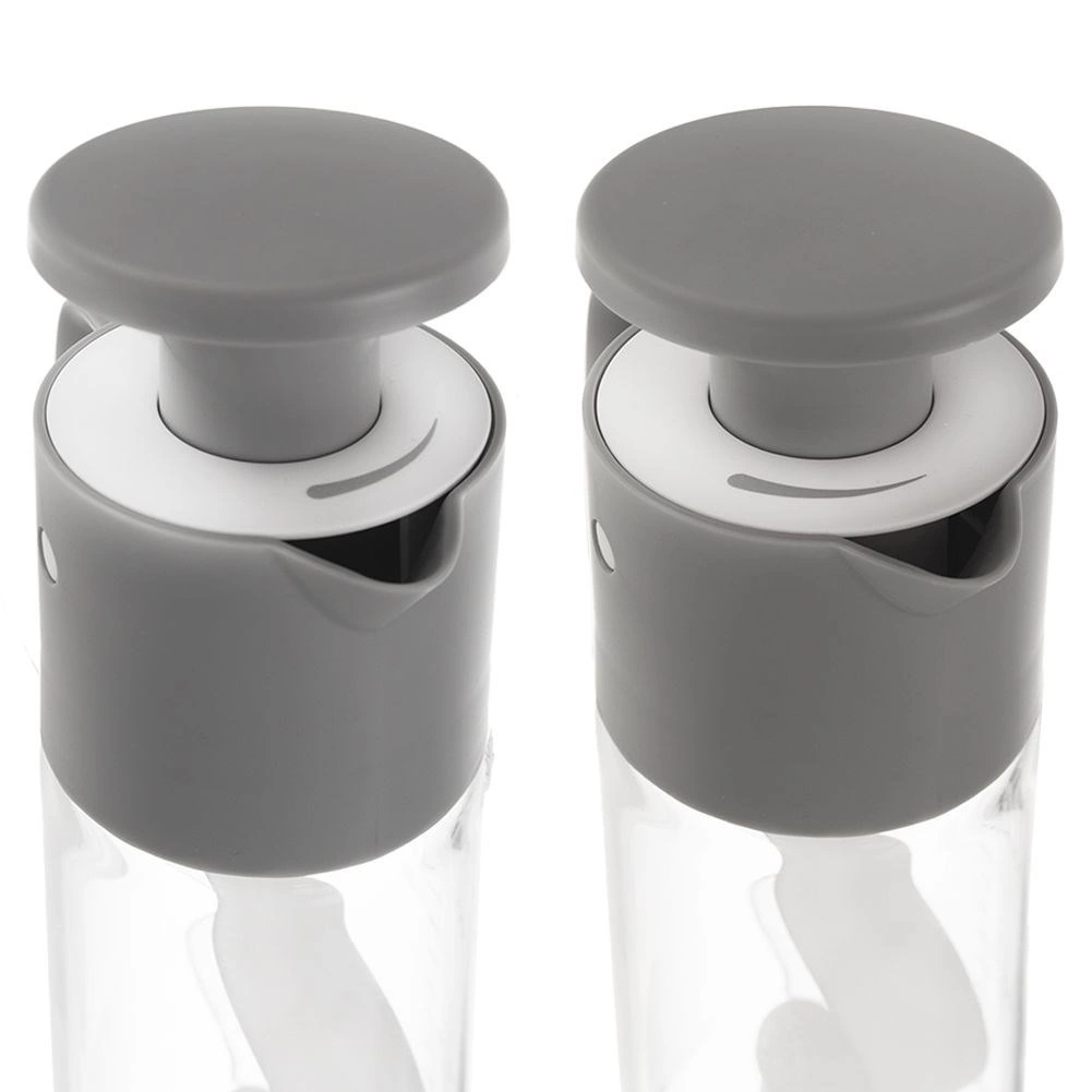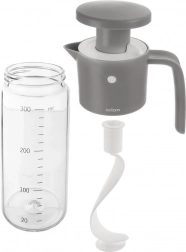Această sticlă universală funcționează ca un mixer manual – pistonul din capac antrenează un agitator spiral, care unește rapid și uniform ingredientele precum ulei, oțet, miere, muștar sau condimente. Ceașca gradată integrată de la 20 la 300 ml, din 20 în 20 ml, asigură proporții precise pentru fiecare rețetă.