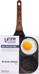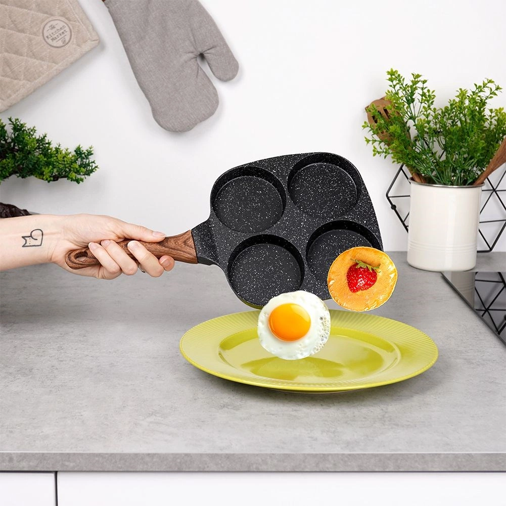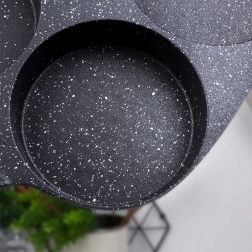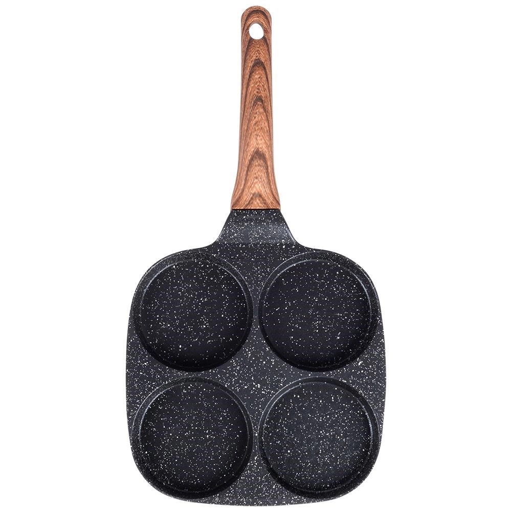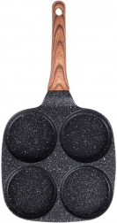 Tigaie practică cu patru forme rotunde cu diametrul de 8,5 cm pentru ouă perfect conturate, clătite mici și pancakes. Corp din aluminiu rezistent cu suprafață antiaderentă tip granit în culoare neagră, care permite gătirea cu minimum de grăsime, conduce uniform căldura și economisește timp și energie. Mâner ergonomic cu decor de lemn, confortabil, antiderapant, cu orificiu pentru agățare. Tigaia este potrivită pentru gaz, electric, vitroceramic, halogen și inducție și este ușor de curățat, inclusiv în mașina de spălat vase.