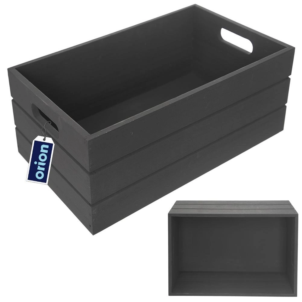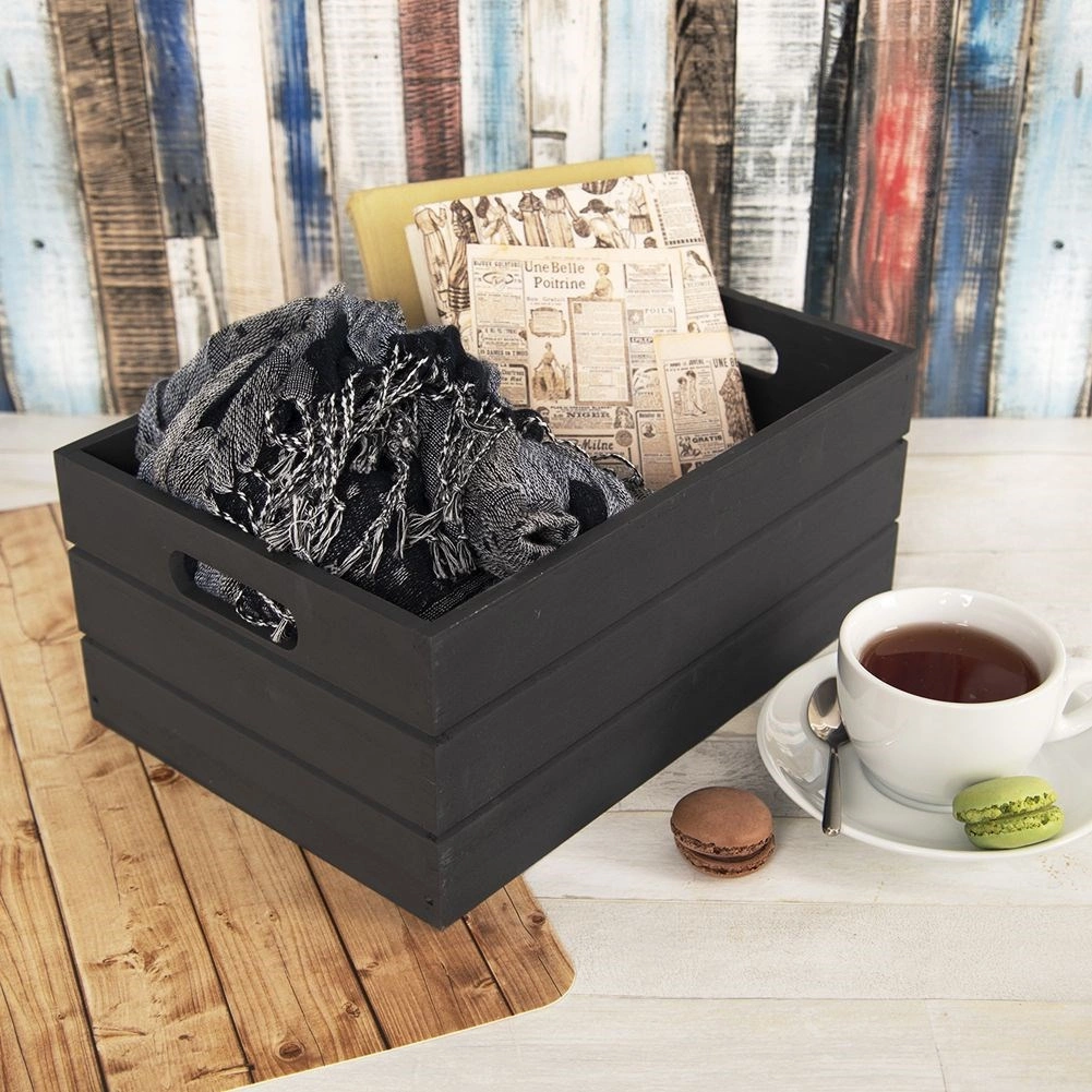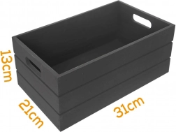 Cutia universală din lemn în finisaj elegant negru ajută la menținerea ordinii în orice încăpere. Datorită lemnului robust și celor două deschideri laterale, se transportă ușor și rezistă utilizării zilnice. Se potrivește pe raft, comodă sau birou.