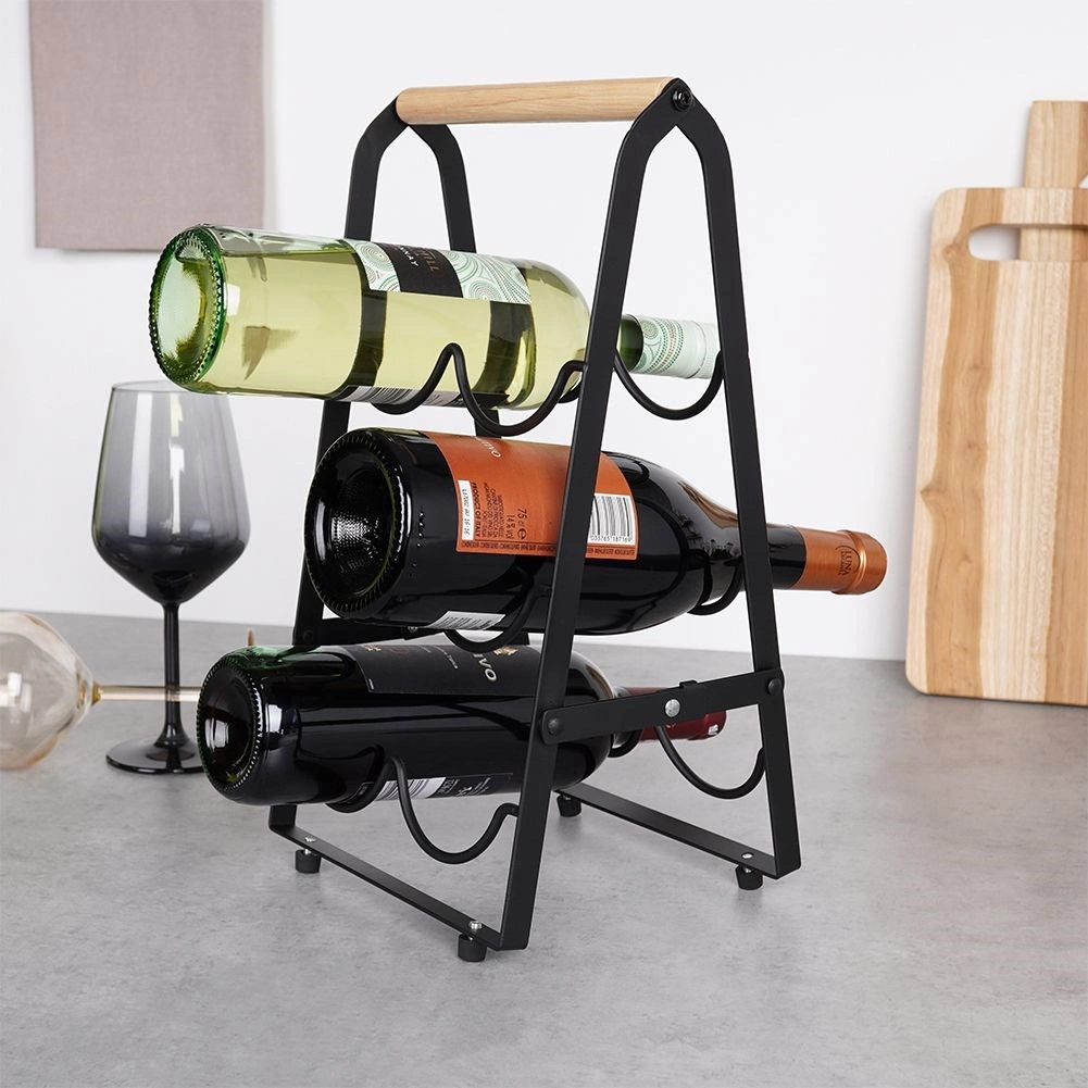 Cadrul robust în formă de A, cu suporturi ondulate, fixează ferm sticlele și le protejează de rostogolire. Picioarele antiderapante și de protecție oferă stabilitate și protejează suprafețele. Suportul este compact, organizat și vă ajută să aveți întotdeauna la îndemână sticlele preferate – de la vin la alte băuturi spirtoase.