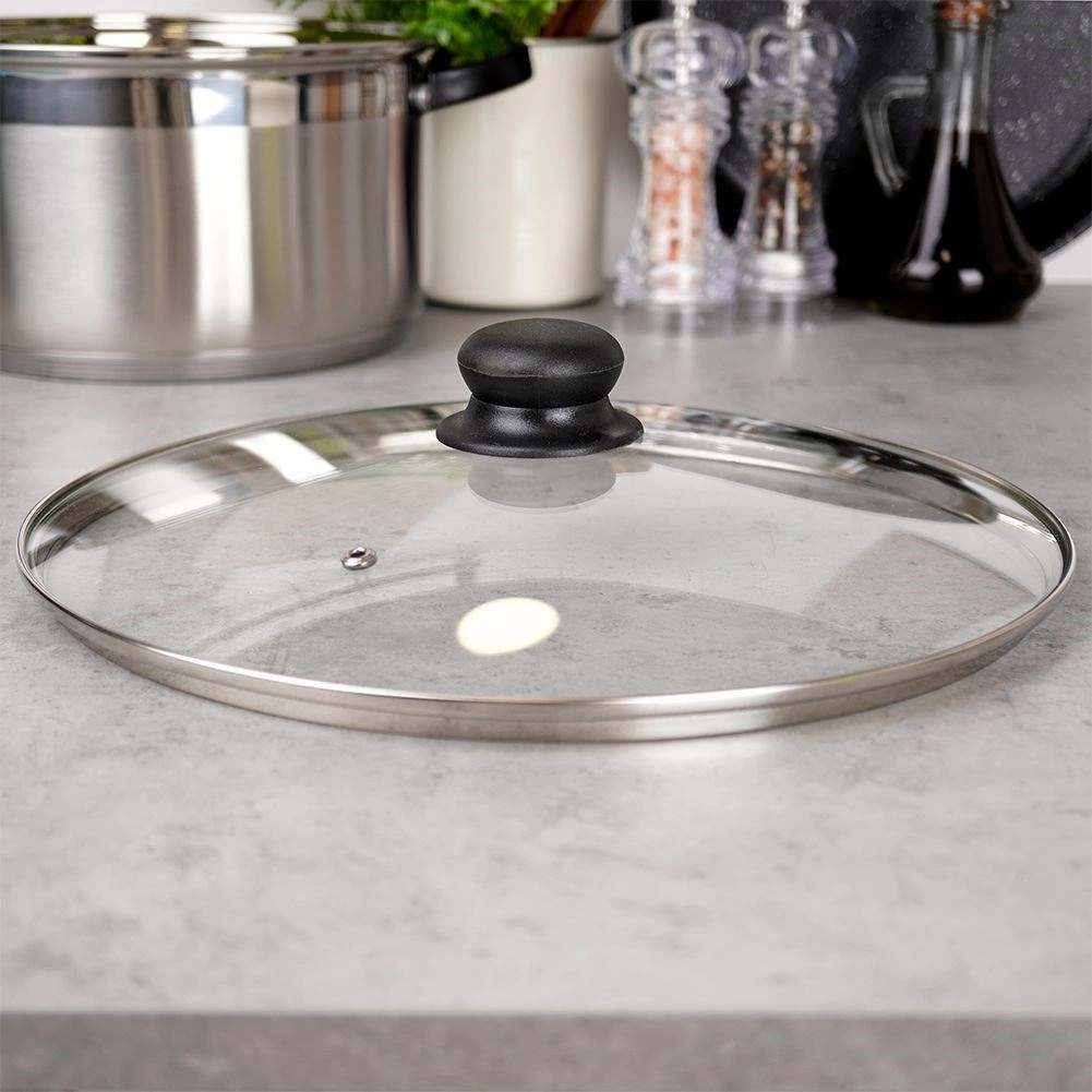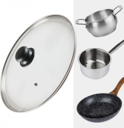 Capacul de sticlă fiabil de 30 cm este un ajutor practic în orice bucătărie. Accelerează gătirea și prăjirea, reduce stropirea apei și a grăsimii și ajută la menținerea temperaturii preparatelor mai mult timp. Sticla transparentă permite controlul procesului fără a fi nevoie să fie ridicat.
