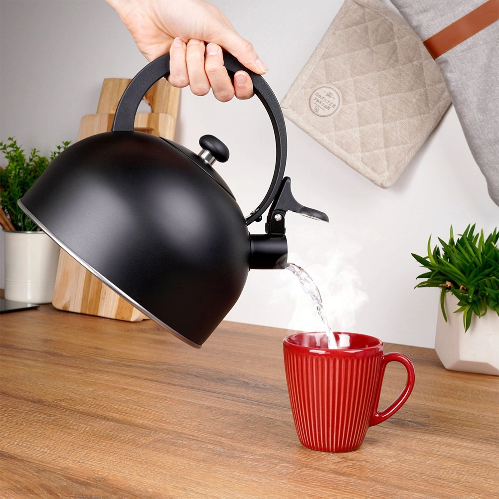 Mânerul ergonomic, rezistent la căldură, și fluierul rabatabil permit turnarea confortabilă și controlată, fără risc de opărire.