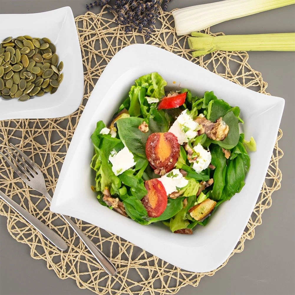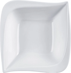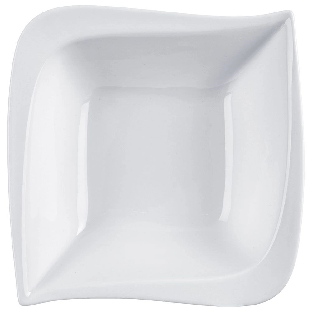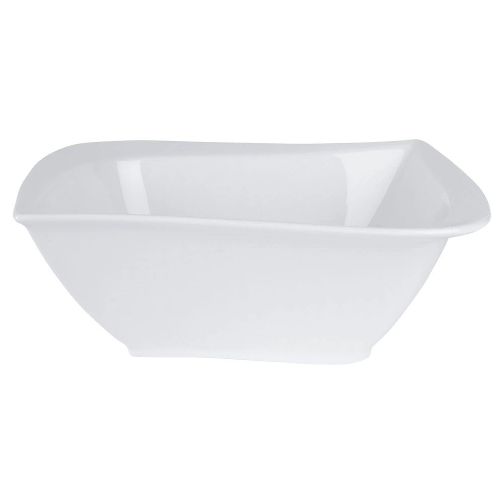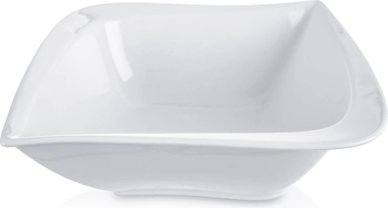 Bol stilat din porțelan de calitate, de culoare albă, o alegere excelentă atât pentru mesele de zi cu zi, cât și pentru ocazii festive. Datorită profilului mai adânc și formei de pătrat neregulat, vei servi comod salate de legume și fructe, garnituri sau gustări precum chipsuri și popcorn.