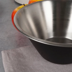 Acest bol de bucătărie universal, din oțel inoxidabil de calitate, cu exterior negru mat, devine ajutorul de încredere atât la gătitul zilnic, cât și la servirea festivă. Marginea lată facilitează manipularea și turnarea precisă, iar forma adâncă este perfectă pentru aluaturi, salate și creme.