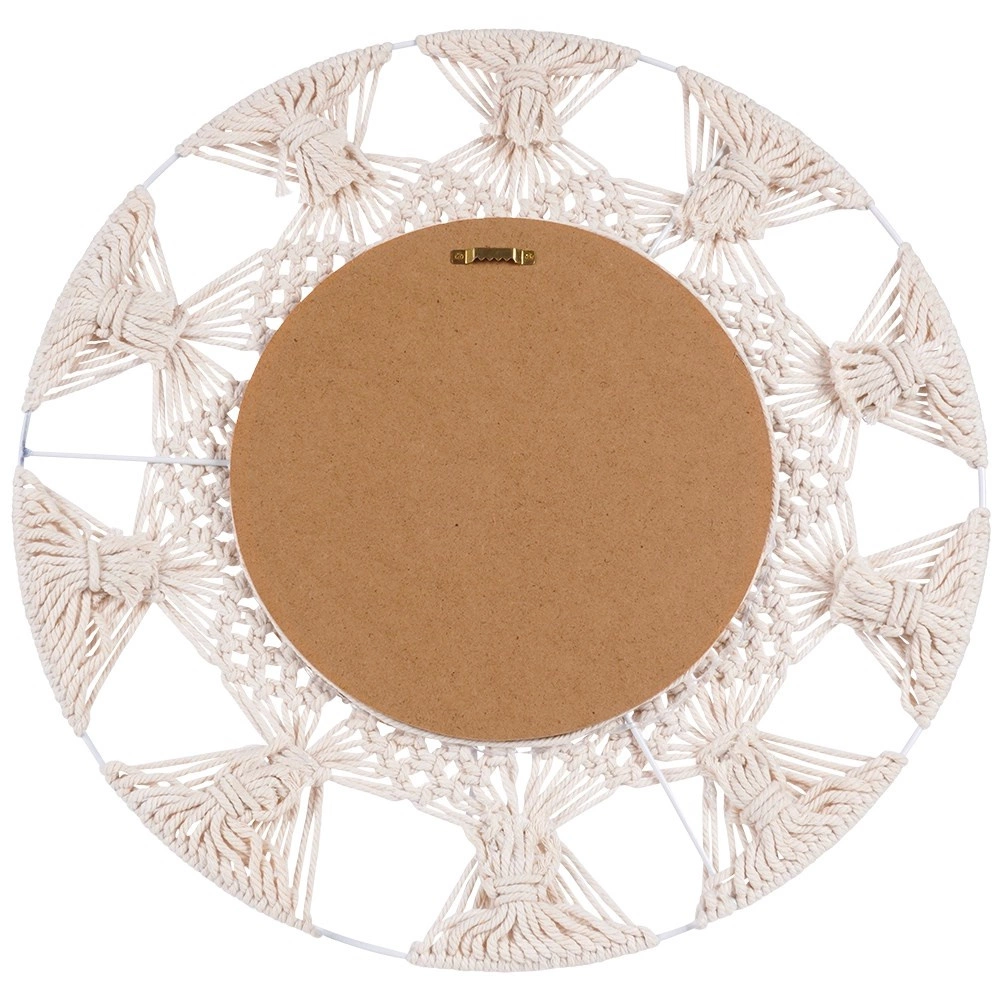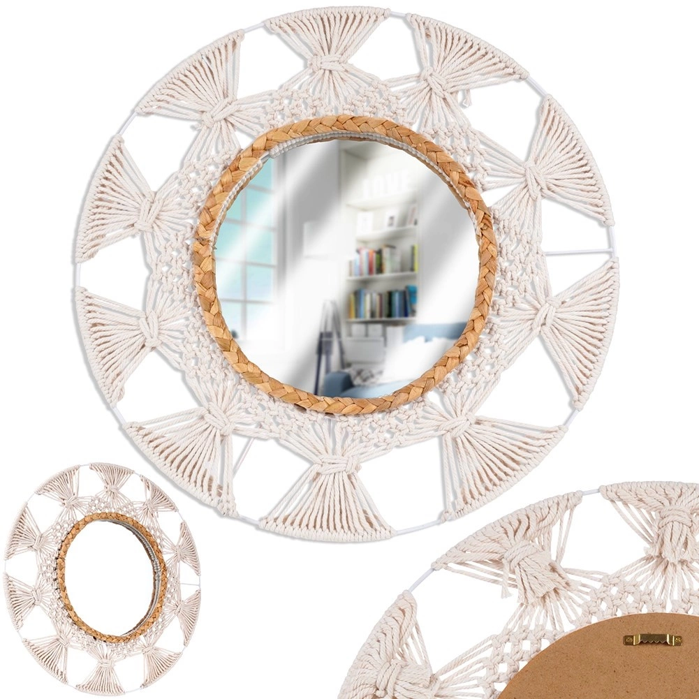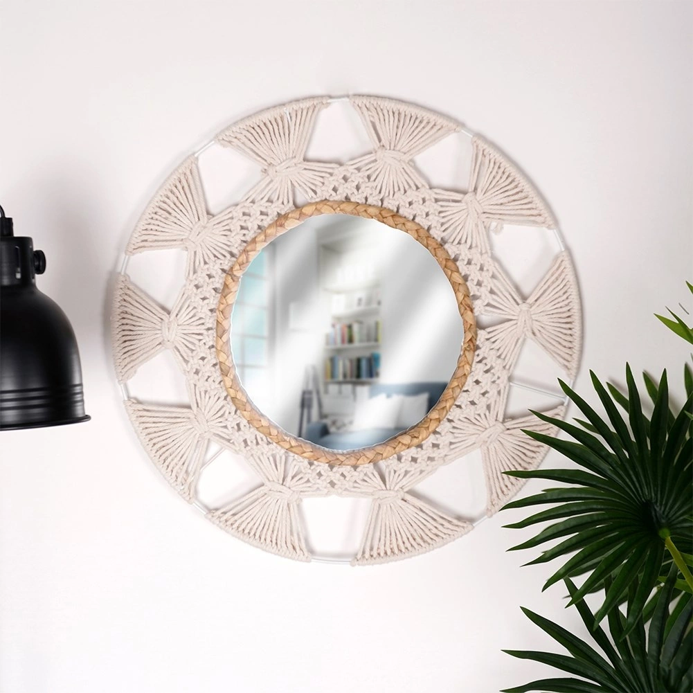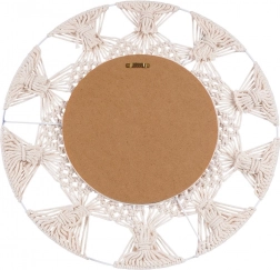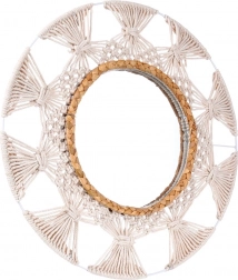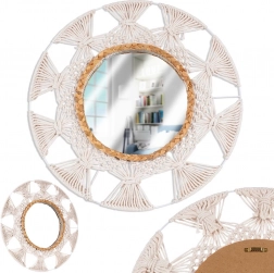 Aduceți lejeritate și căldură în interior cu oglinda rotundă în îndrăgitul stil boho. Combinația dintre împletitura bej din bumbac, care amintește de macramé, și inelul decorativ din iarbă de mare creează un accent unic pe perete. Oglinda oferă imagine clară și naturală și funcționează ca un element atât practic, cât și decorativ.