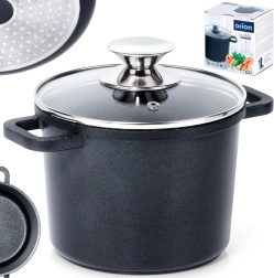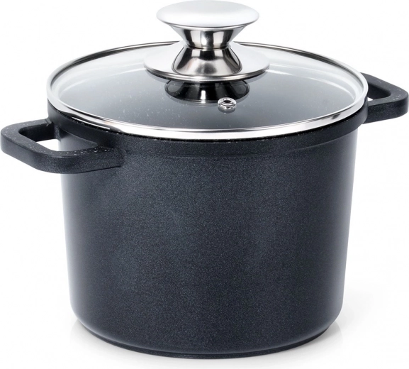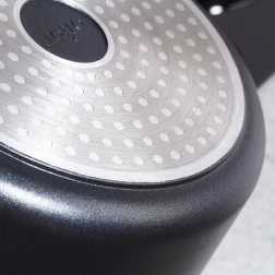 Oală elegantă din aluminiu negru, cu acoperire interioară antiaderentă din granit PFLUON, care împiedică lipirea alimentelor, se întreține ușor și păstrează gustul natural și nutrienții. Capacul de sticlă cu orificiu steam vent permite controlul gătitului fără ridicări inutile.