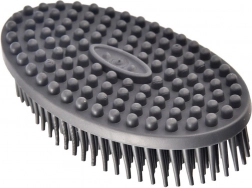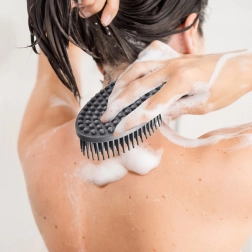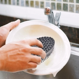 Acest burete practic din silicon 2‑în‑1 combină curățarea eficientă cu îngrijirea delicată. Designul pe două fețe oferă peri mai lungi și moi pentru îndepărtarea murdăriei și grăsimii, iar cealaltă față are proeminențe rotunjite pentru frecare blândă și un masaj plăcut. Datorită materialului termoplastic foarte elastic, se adaptează suprafețelor, se clătește ușor și se usucă rapid.