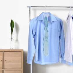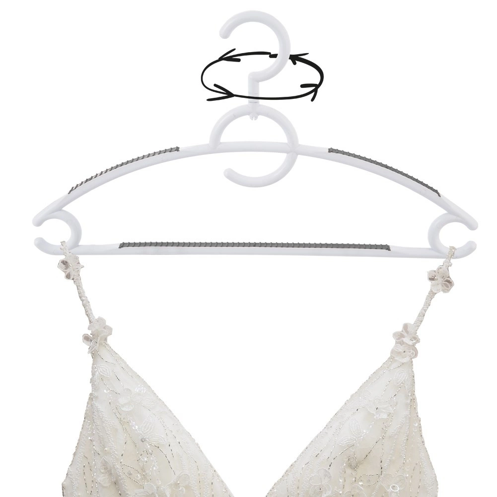 Fiecare umeraș are benzi antiderapante din cauciuc pe umeri și pe bara inferioară, astfel încât hainele nu alunecă. Nu lipsesc cârligele laterale pentru bretelele rochiilor și bara inferioară pentru pantaloni sau eșarfe. Cârligul pivotant îți permite să agăți hainele exact cum ai nevoie – în dulap, pe stativ sau în magazin.