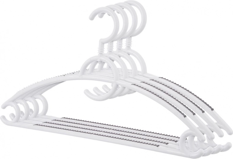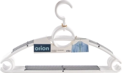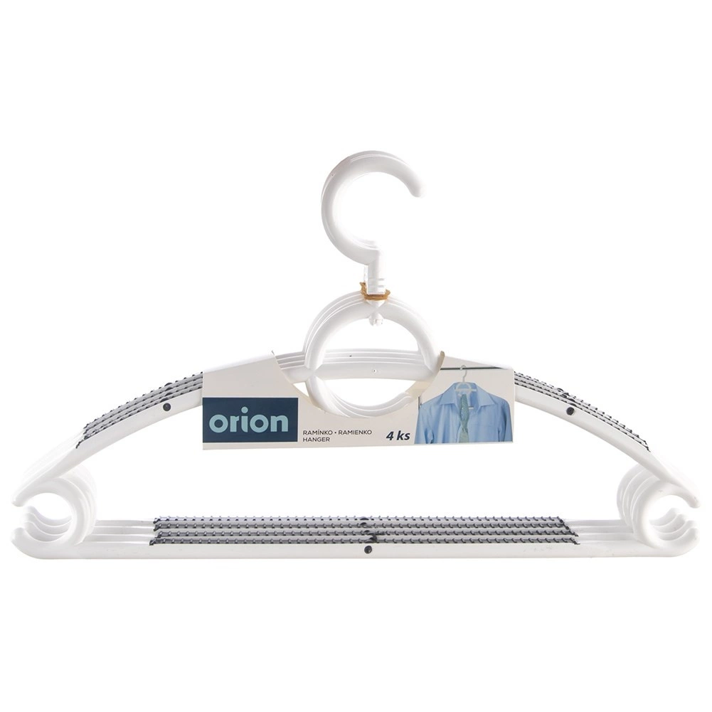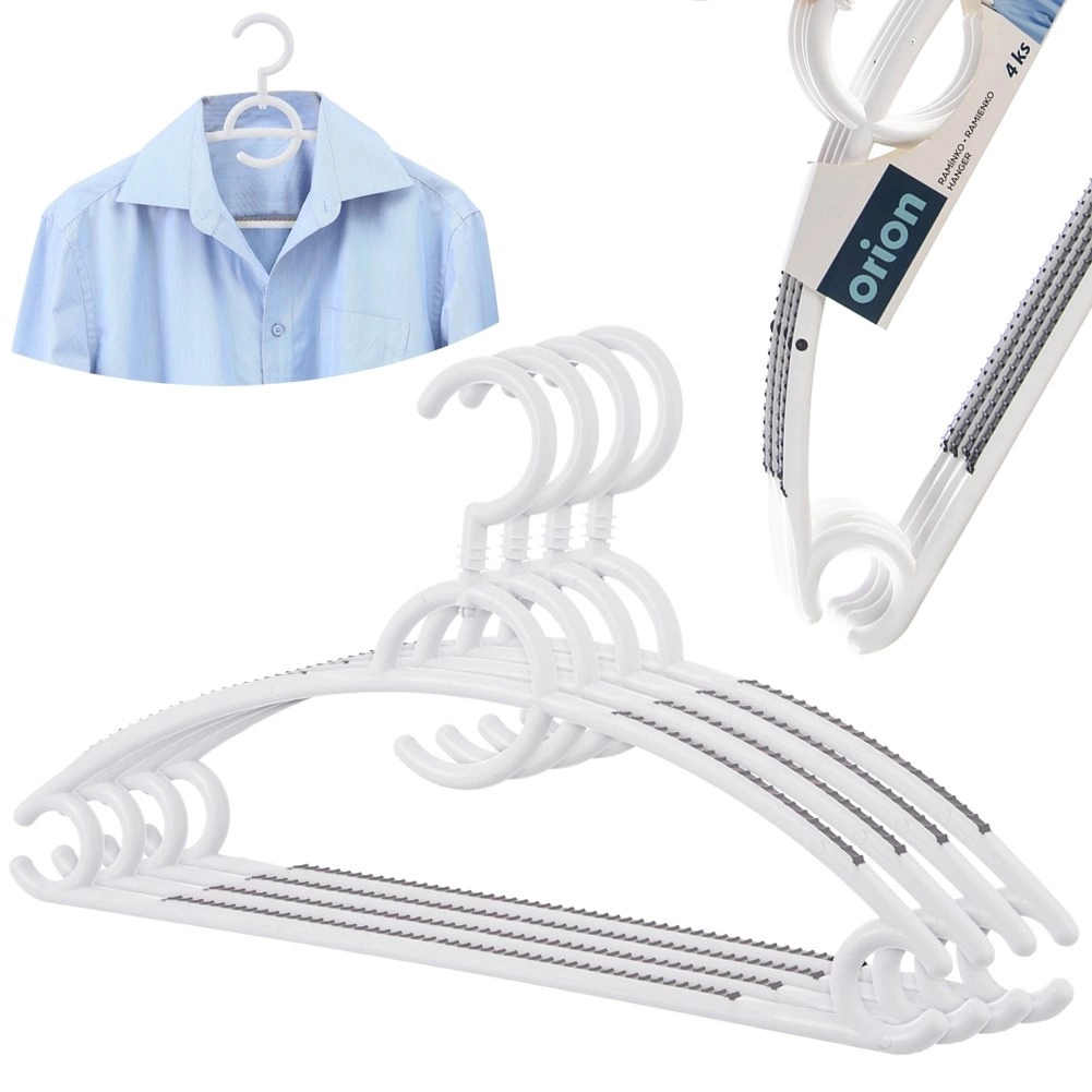 Set universal de 4 umerașe albe cu cârlig pivotant și inserturi antiderapante pentru agățarea în siguranță a cămășilor, rochiilor, pantalonilor și sacourilor. Construcție solidă, mai multe puncte de agățare și economisire de spațiu în dulap pentru ordine perfectă. Calitate ORION conform standardelor europene.