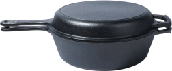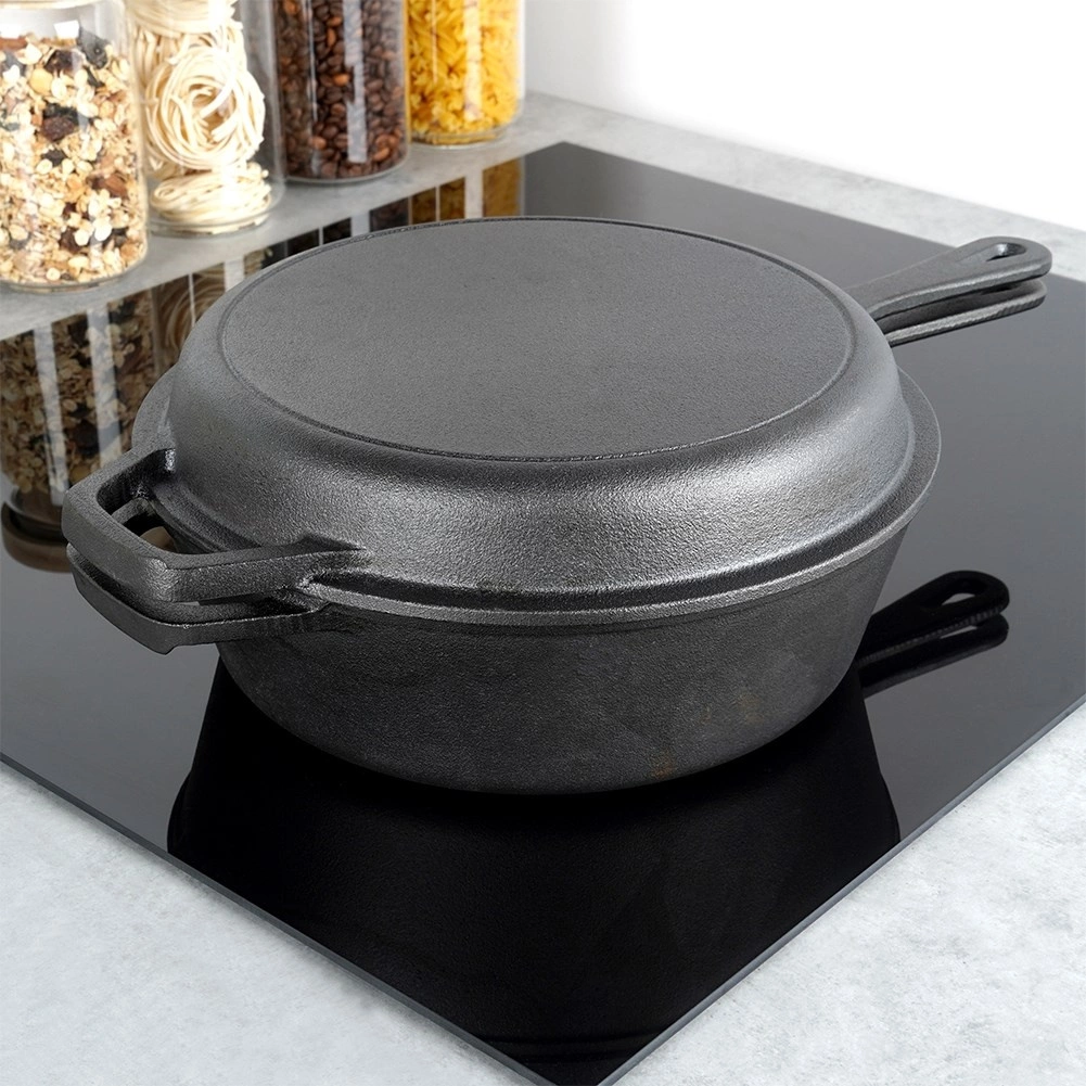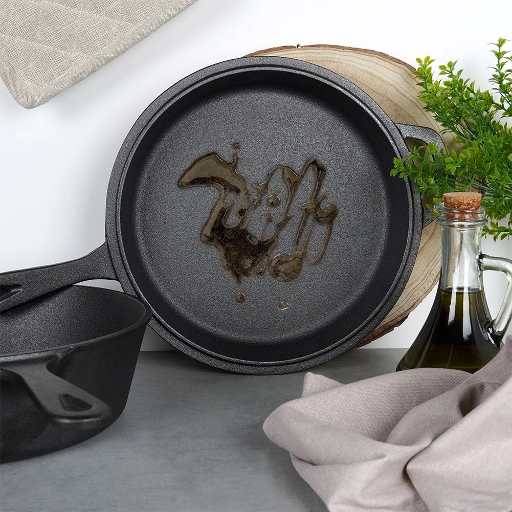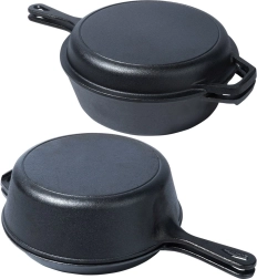 Set robust din fontă pentru gătit universal: oală adâncă și tigaie joasă, care se potrivesc perfect – tigaia poate servi drept capac. Fonta asigură distribuție uniformă a căldurii, acumulare îndelungată și este ideală pentru prăjire, coacere și înăbușire pe aragaz, în cuptor și deasupra focului. Construcția rezistentă cu mânere duble și compatibilitatea cu gaz, electric, vitroceramic și inducție fac din acest set un partener de încredere pentru orice bucătărie și pentru camping.