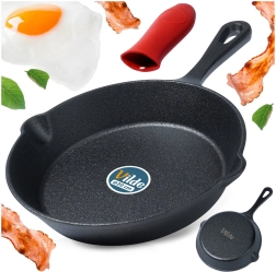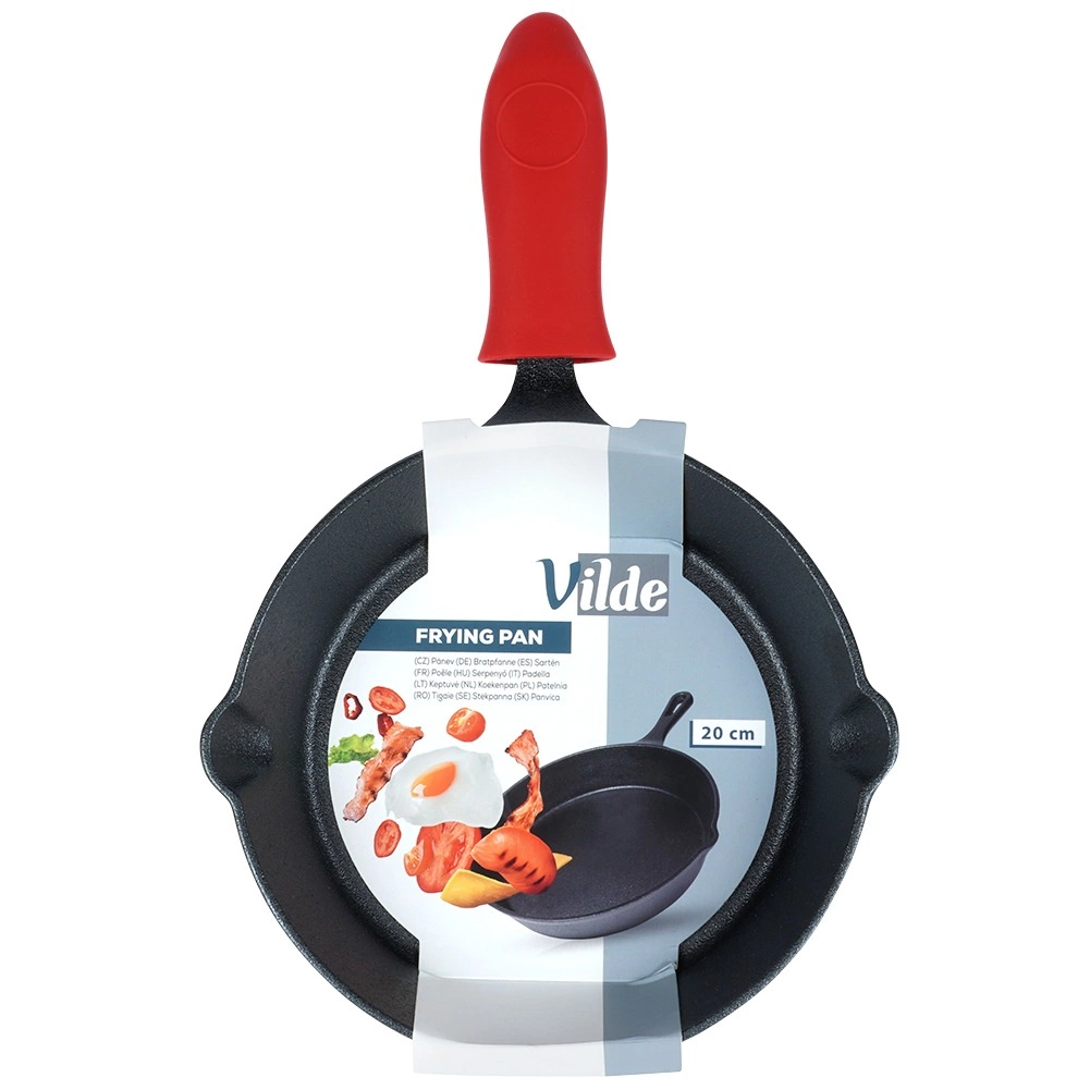 Această tigaie compactă din fontă de 20 cm este ideală pentru prăjire, sotare, coacere și servirea garniturilor. Corpul masiv din fontă se încălzește rapid și uniform și păstrează temperatura mult timp, astfel încât mâncarea rămâne mai mult timp caldă și suculentă. Cele două ciocuri practice facilitează scurgerea sosurilor sau a grăsimii, iar mâneca din silicon roșie sporește siguranța la manipulare.