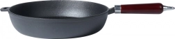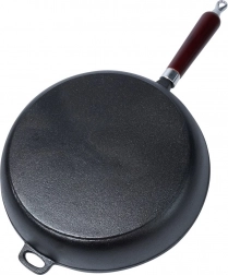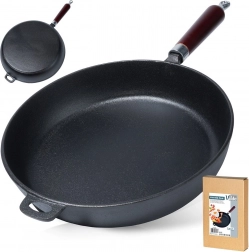 Tigaie universală din fontă, diametru 30 cm, pentru gătit zilnic acasă și în aer liber. Datorită corpului masiv conduce și menține excelent căldura, are pereți adânci, mâner ergonomic din lemn și ureche auxiliară pentru transport sigur. Potrivită pentru inducție, gaz, electric, vitroceramică, halogen și pentru cuptor după demontarea mânerului.