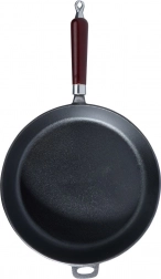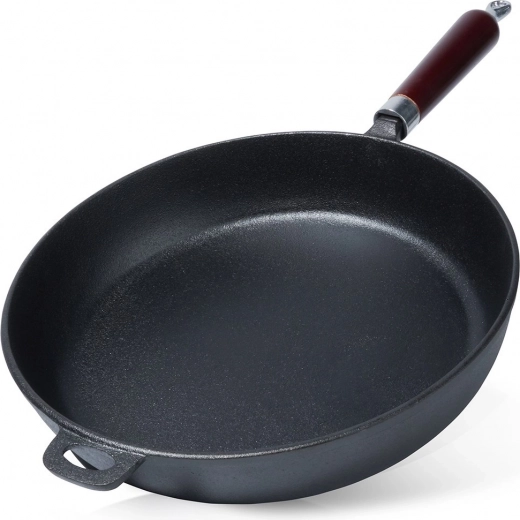 Mânerul din lemn oferă o prindere sigură, urechea auxiliară ușurează manipularea și agățarea. Tigaia poate fi utilizată pe toate tipurile de plite, inclusiv inducție, precum și pe grătar sau foc deschis. După desfiletarea mânerului, este potrivită și pentru cuptor. Fără straturi antiaderente – veselă din fontă pură pentru rezultate naturale la gătit.