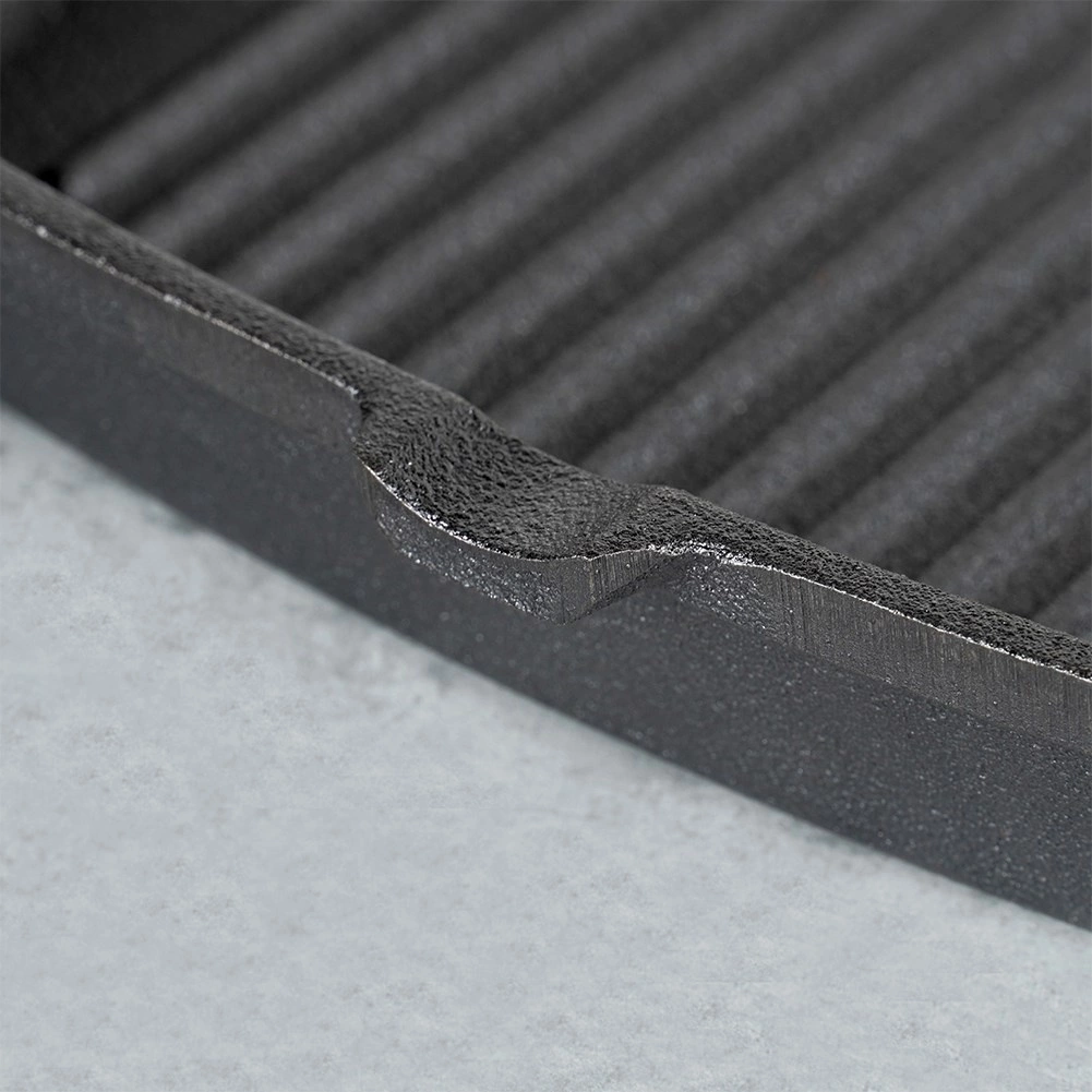 Striațiile înalte creează dungi pronunțate de grătar și evacuează grăsimea. Ciocurile integrate facilitează turnarea sucurilor și a grăsimii.