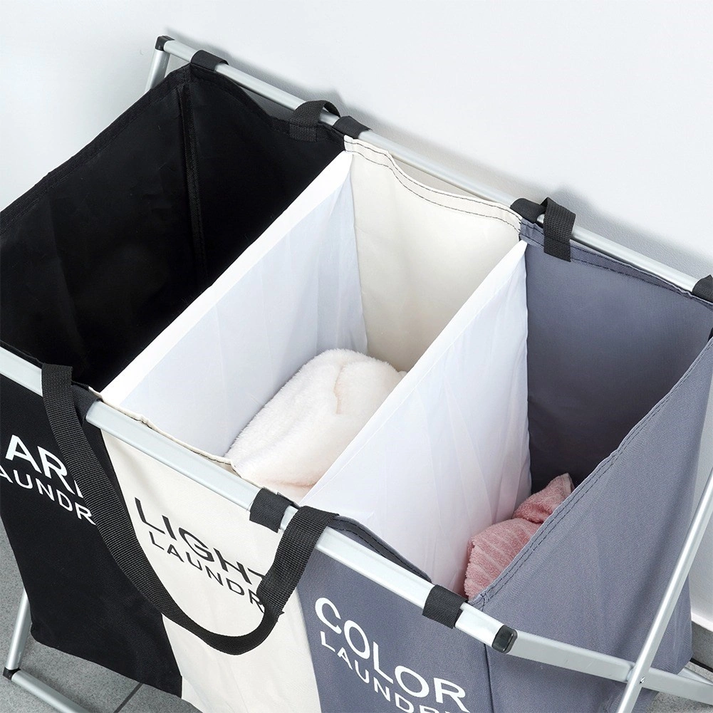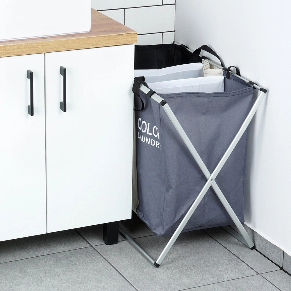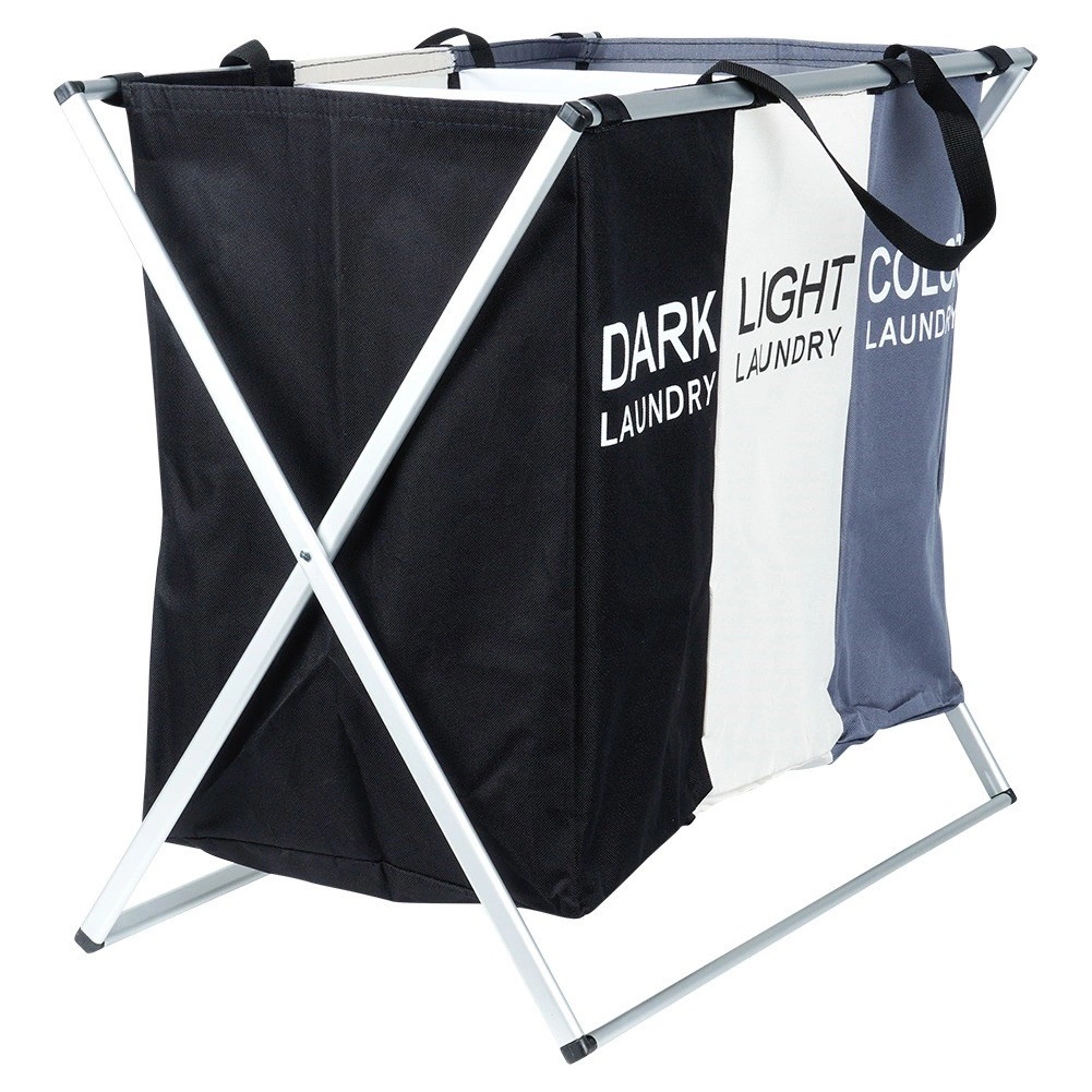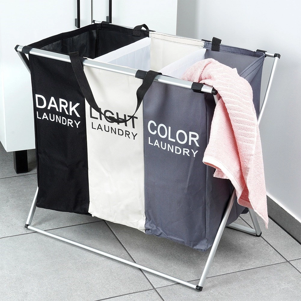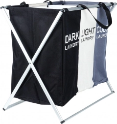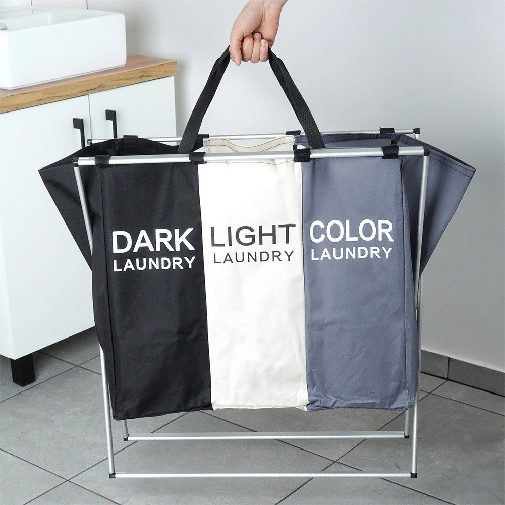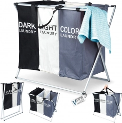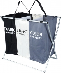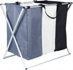 Mențineți ordinea rufelor cu un coș clar împărțit în trei compartimente, care permite sortarea imediată în închise la culoare, deschise la culoare și colorate. Cadrul metalic ușor, dar stabil, în culoare argintie, și sacii textili rezistenți asigură durabilitate și utilizare confortabilă în fiecare zi.