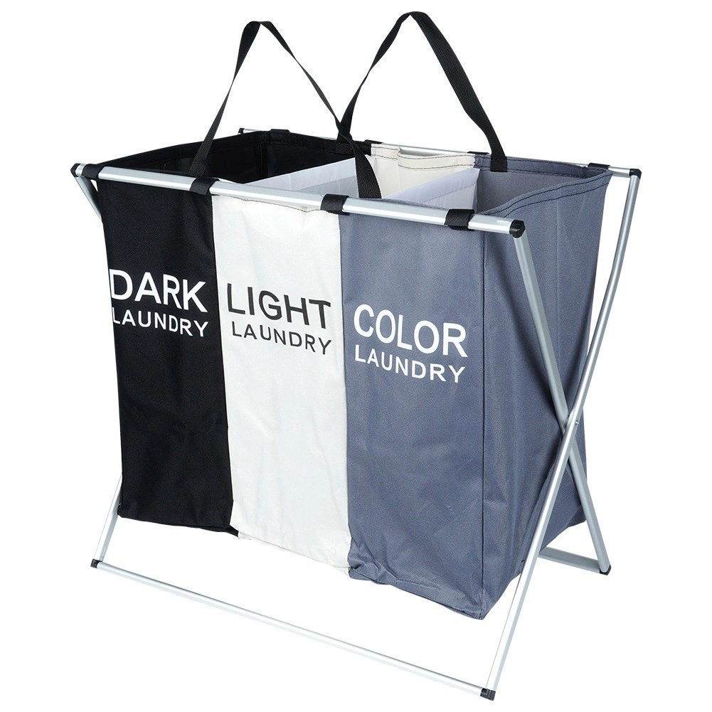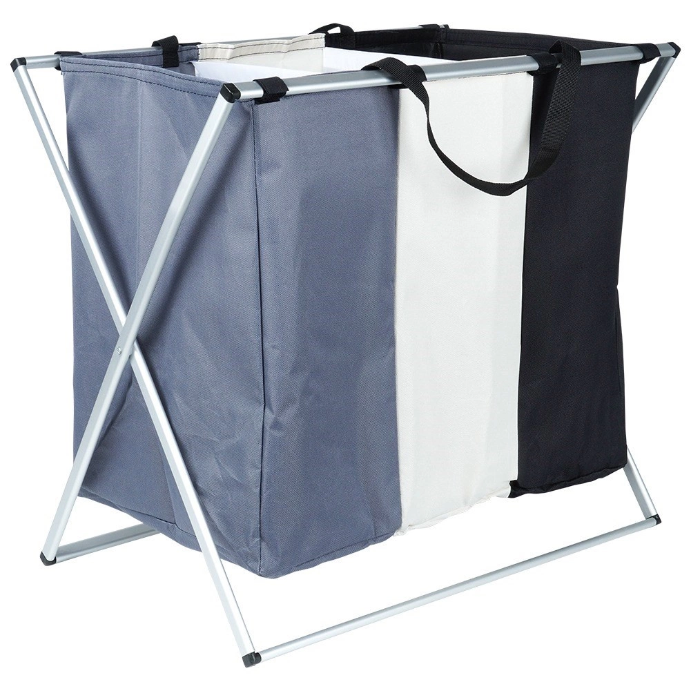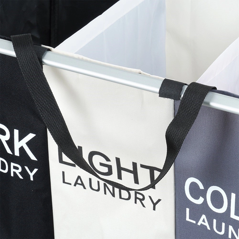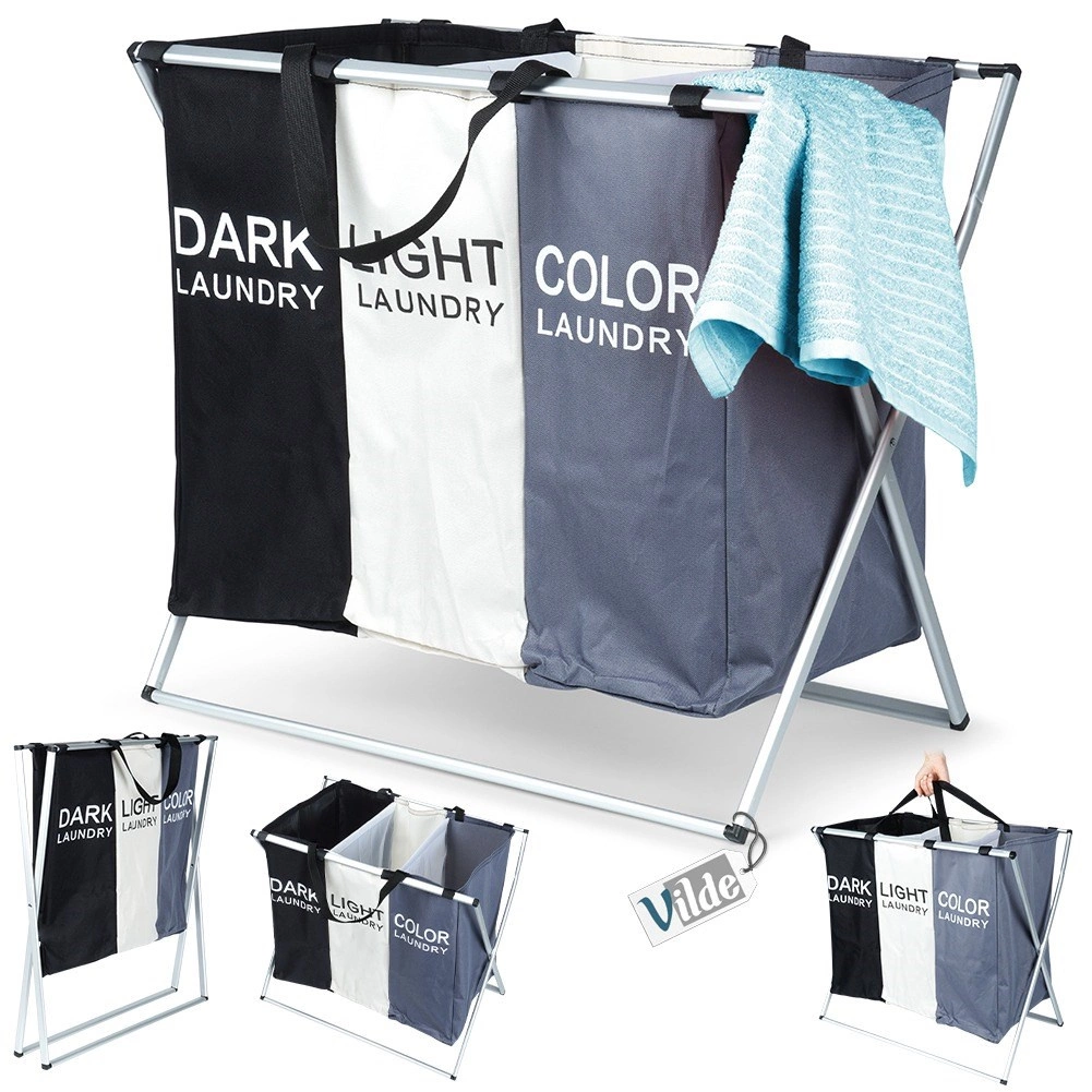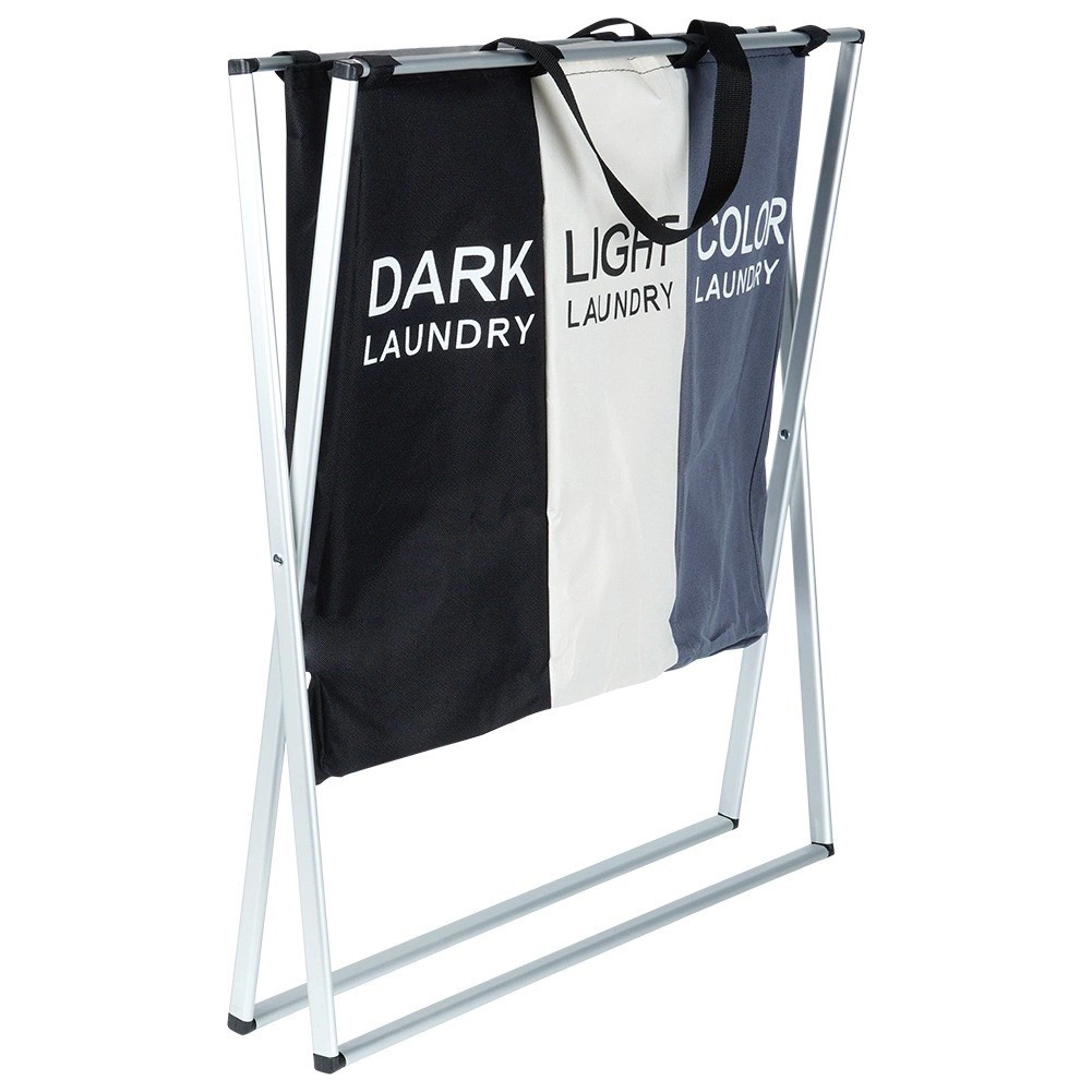 Mențineți ordinea rufelor cu un coș clar împărțit în trei compartimente, care permite sortarea imediată în închise la culoare, deschise la culoare și colorate. Cadrul metalic ușor, dar stabil, în culoare argintie, și sacii textili rezistenți asigură durabilitate și utilizare confortabilă în fiecare zi.