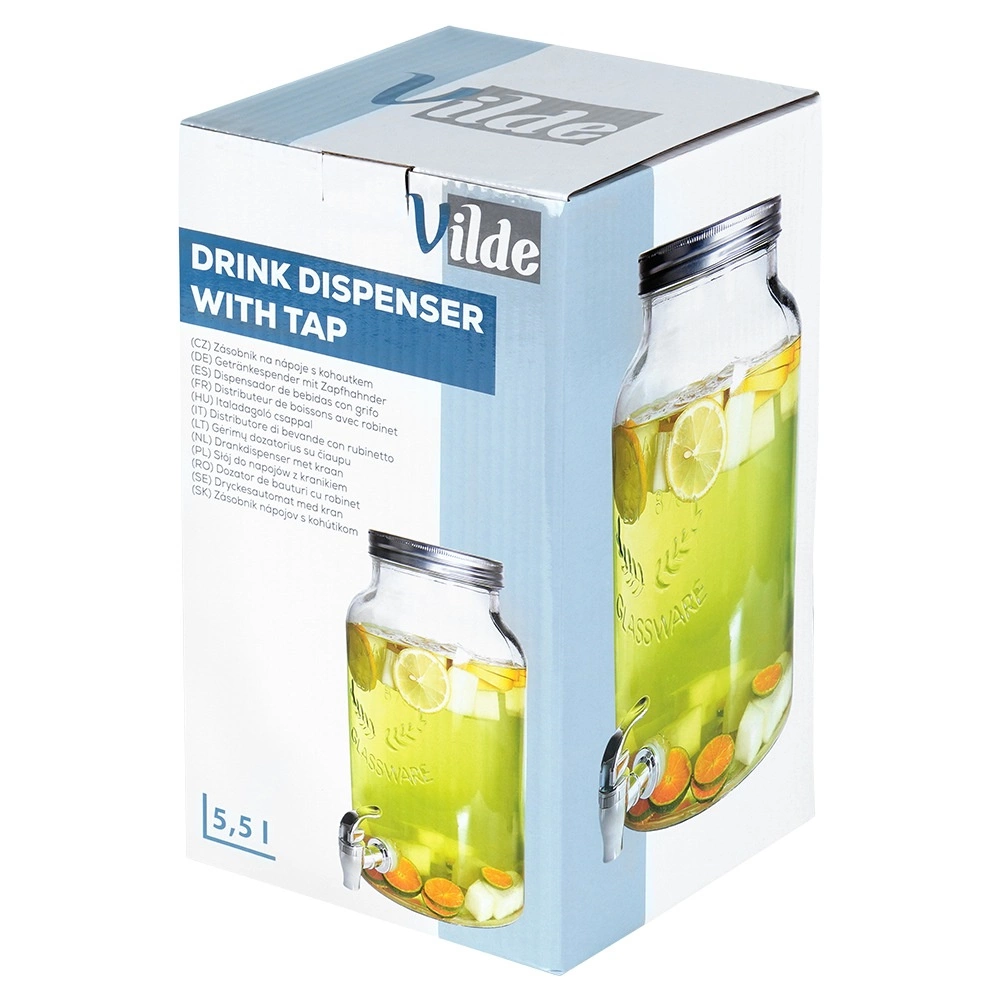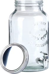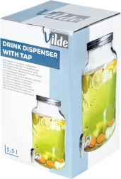 Capacul cu filet protejează conținutul de insecte, gâtul larg asigură o umplere ușoară și introducerea cuburilor de gheață și a fructelor. Sticla groasă cu inscripție reliefată subliniază aspectul atractiv. Dispenserul este destinat băuturilor reci și răcite (nu este potrivit pentru băuturi fierbinți).