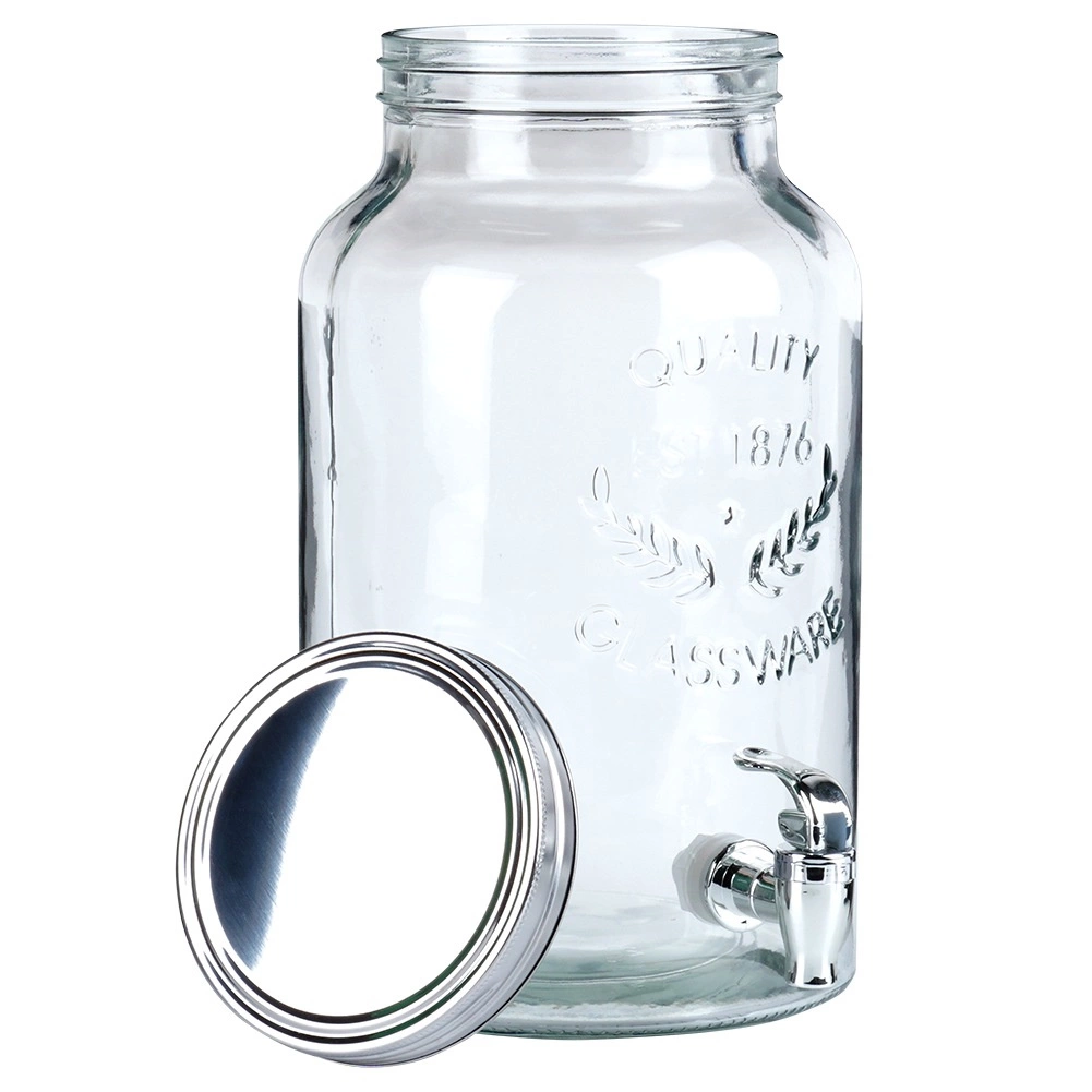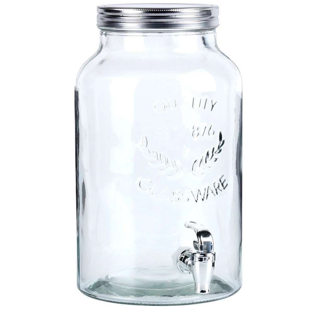 Dispenser stilat din sticlă pentru băuturi, cu un volum de 6,2 l, echipat cu robinet practic și capac metalic cu filet. Ideal pentru limonade, punch, ape aromatizate și ceaiuri cu gheață. Gura largă facilitează umplerea și curățarea, sticla reliefată oferă un aspect elegant, iar materialele sunt sigure pentru contactul cu alimentele.
