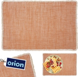 Suport de masă dreptunghiular, dimensiuni 45 × 30 × 0,5 cm, în culoare portocalie cu margine bej, realizat din fibră de poliester rezistentă. Ideal sub farfurii, cești sau vaze, protejează masa împotriva zgârieturilor și murdăriei și, în același timp, este un accesoriu decorativ pentru sufragerie și bucătărie. Ușor de întreținut – este suficient să fie șters cu o cârpă umedă. Ideal pentru interioare în stil boho și pentru utilizare zilnică. Protecție pentru masă, întreținere ușoară, aspect decorativ.