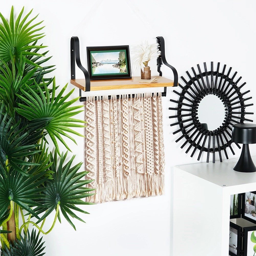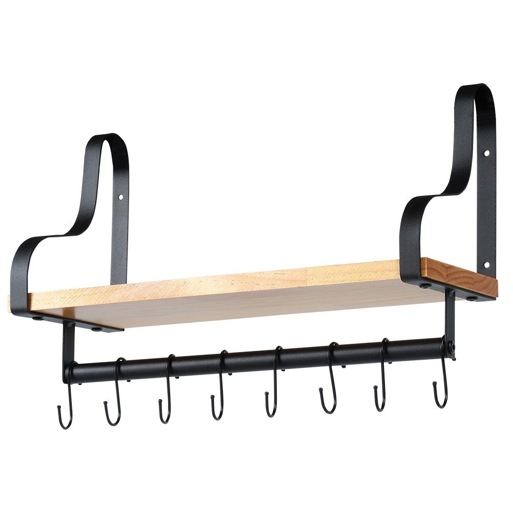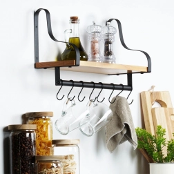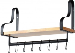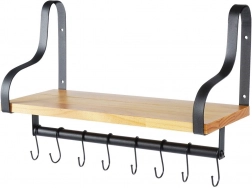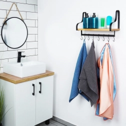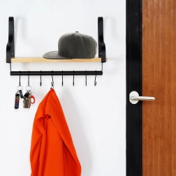 Descoperiți o soluție inteligentă pentru organizarea locuinței. Această etajeră de perete oferă o suprafață de depozitare stabilă din lemn natural și dedesubt o bară cu 8 cârlige utilă pentru agățarea cănilor, prosoapelor, cheilor sau prosoapelor de mână. Rama metalică minimalistă, neagră, subliniază aspectul industrial modern, ușor de asortat cu interioare moderne sau clasice.