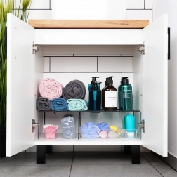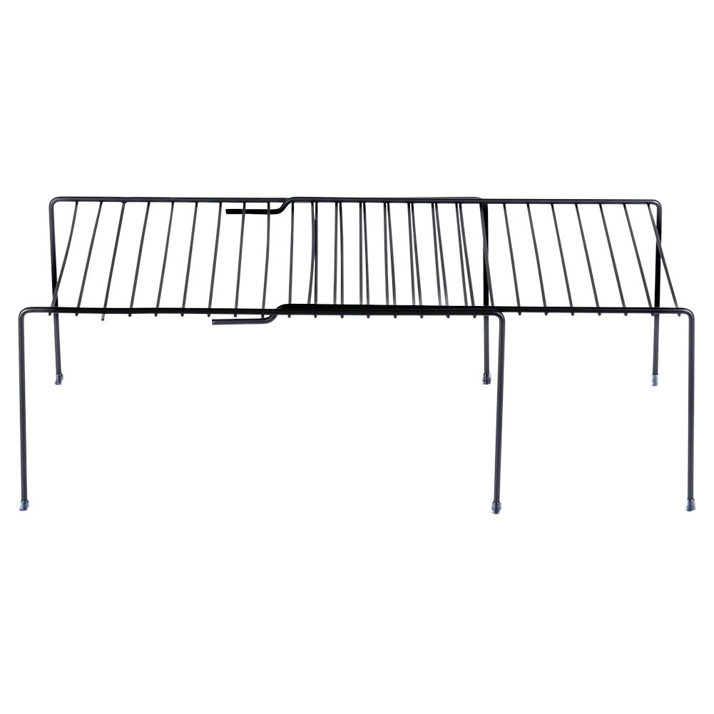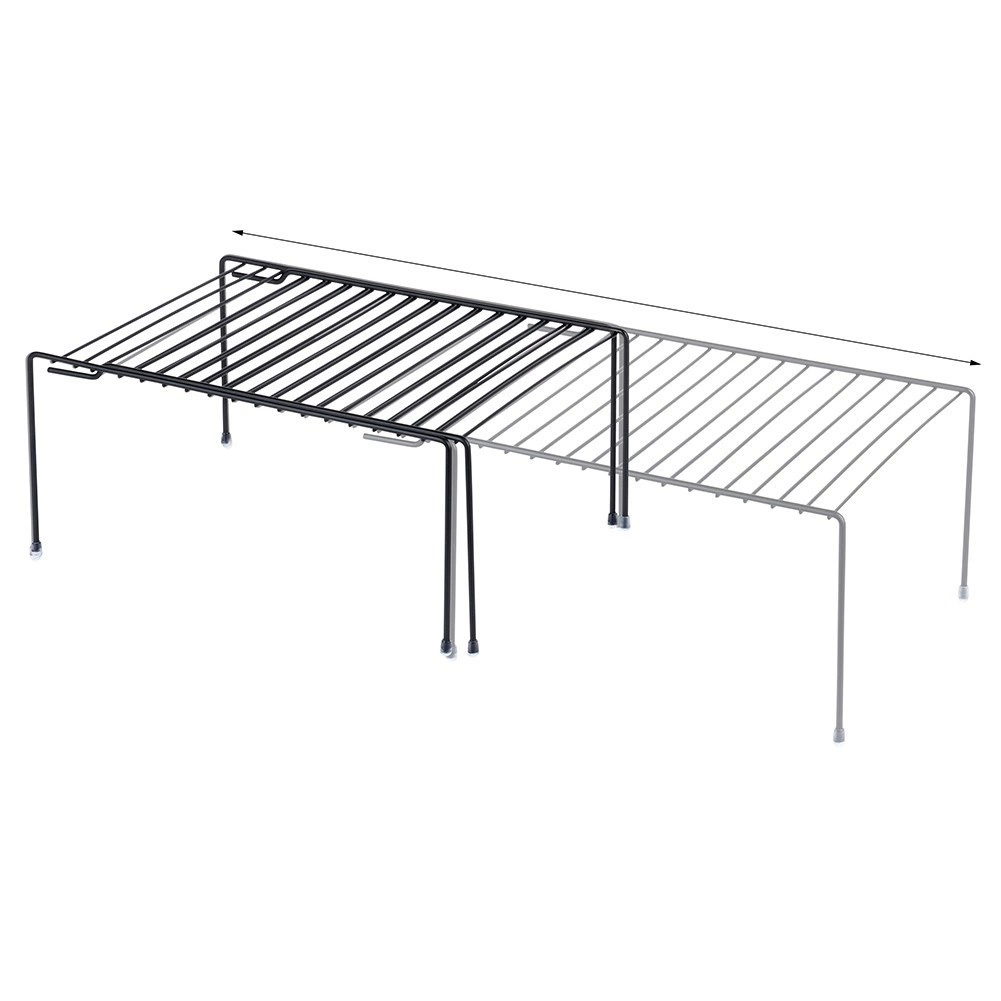 Valorificați la maximum fiecare raft. Polița metalică extensibilă, în elegantul negru, împarte eficient înălțimea dulapului în două niveluri, astfel încât vesela, conservele sau paharele vor fi depozitate ordonat și în siguranță. Datorită reglajului lin al lungimii de la 34,5 la 48 cm, o adaptați ușor la dulapuri și rafturi de lățimi diferite.