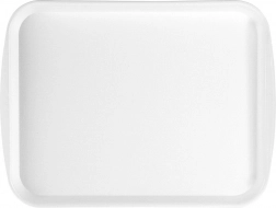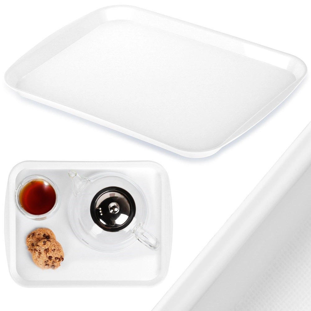 Tavă de servire albă, practică, din plastic rezistent, cu dimensiunile 35,5 × 27 × 2,5 cm, pentru utilizare zilnică acasă și în gastronomie. Datorită suprafeței antiderapante și marginii înalte veți transporta în siguranță băuturi, deserturi și chiar mic dejunuri complete. Tava este ușoară, ușor de curățat și potrivită pentru mașina de spălat vase.