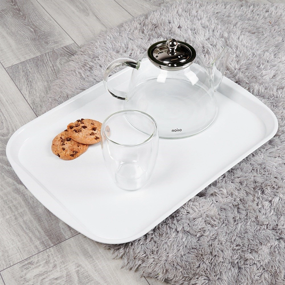 Formatul generos de 43,5 × 31,5 cm cuprinde confortabil ceainicul, cănile și farfuriile – ideal pentru uz casnic și profesional.