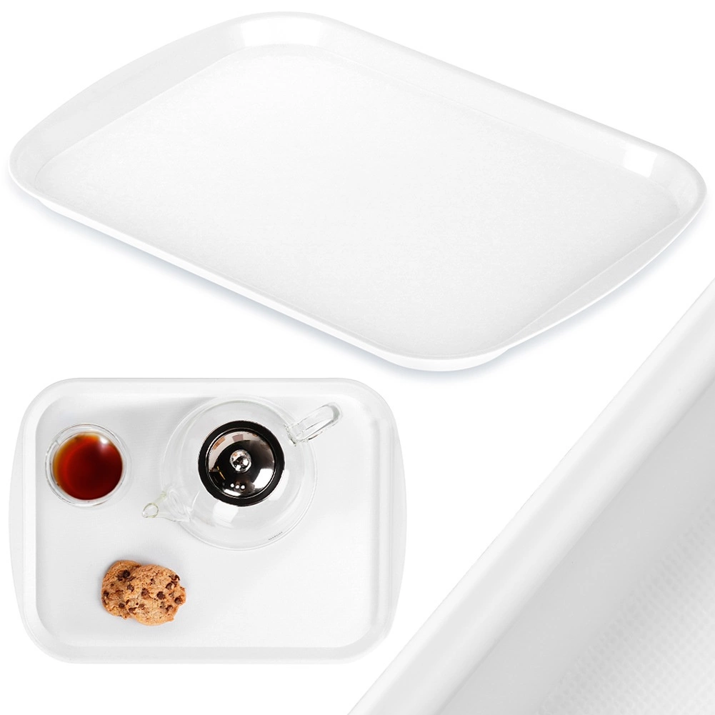 Tavă de servire universală, în culoare albă elegantă, facilitează servirea cafelei, ceaiului, deserturilor și a preparatelor gata. Plasticul ușor, dar solid rezistă utilizării zilnice acasă, la birou și în unități HoReCa. Datorită dimensiunilor de 43,5 × 31,5 cm oferă spațiu suficient pentru farfurii, pahare și ceainice.