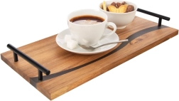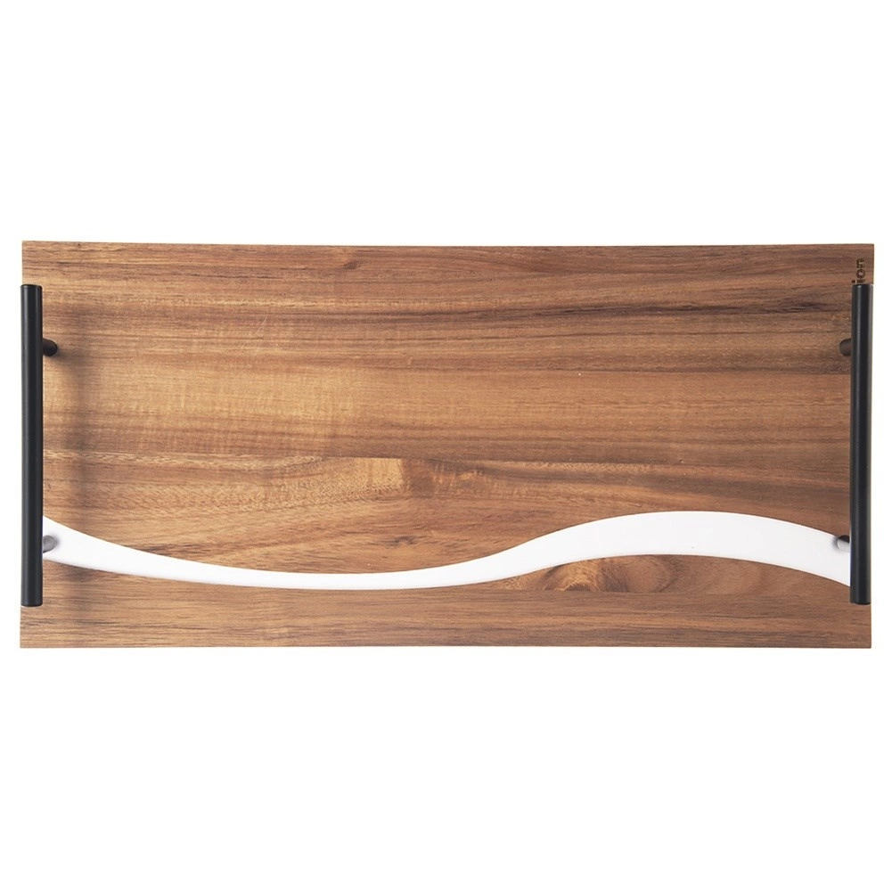 Tava dreptunghiulară RIVER îmbină lemnul natural de salcâm cu rășina decorativă, care creează un efect unic de „râu”. Datorită mânerelor metalice negre, puteți transporta comod cești, ceainicul, pahare și farfurii. Este grozavă atât pentru servirea zilnică, cât și pentru momente festive.