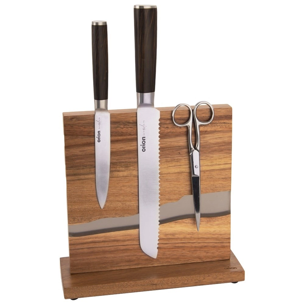 Elegantul suport pentru cuțite, dublu față-verso, din lemn natural de salcâm, cu rășină decorativă în stil „râu”, oferă o suprafață magnetică puternică, depozitare sigură și ordonată pentru cuțite și foarfece și un design modern potrivit pentru orice bucătărie. Datorită depozitării pe ambele fețe, economisește spațiu pe blat, iar padurile de fetru de la bază protejează blatul de lucru împotriva zgârieturilor.