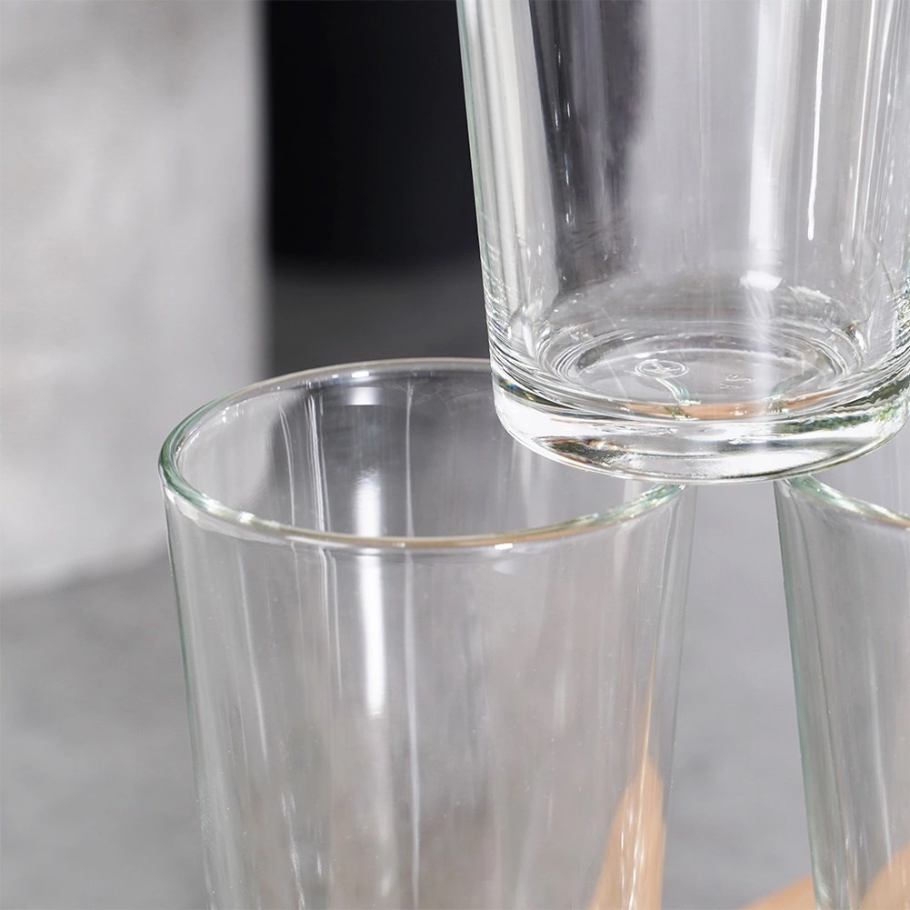 Paharele sunt fabricate din sticlă robustă, transparentă, cu fund gros pentru stabilitate și durată lungă de viață în utilizarea de zi cu zi.