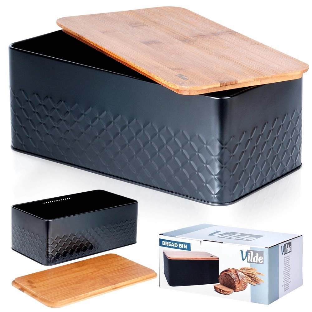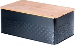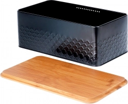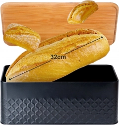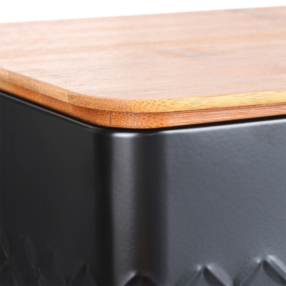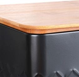 Cutia de pâine stilată combină un corp metalic rezistent, vopsit în câmp electrostatic, de culoare negru mat, cu un capac din bambus natural. Capacul poate fi folosit ca tocător practic, astfel încât feliezi pâinea direct acolo unde o depozitezi. Designul cu textură în relief oferă un aspect modern și se potrivește atât bucătăriilor minimaliste, cât și celor cu accente naturale.