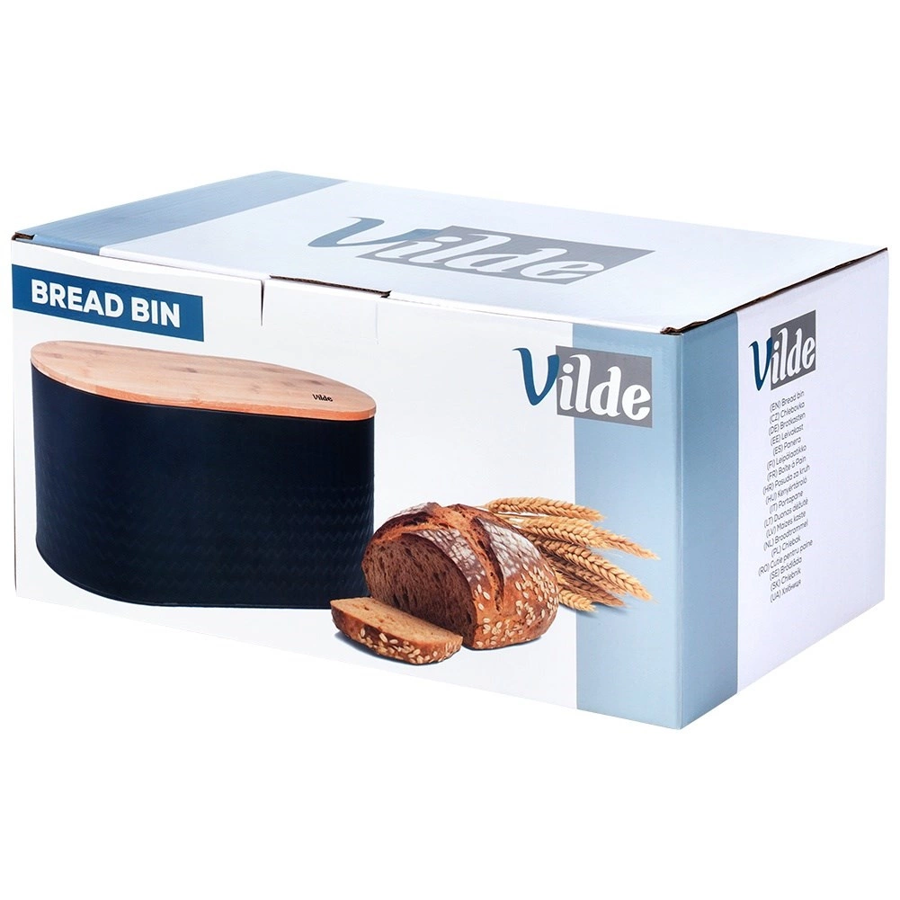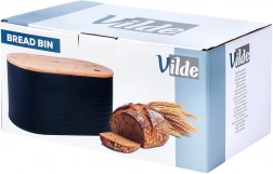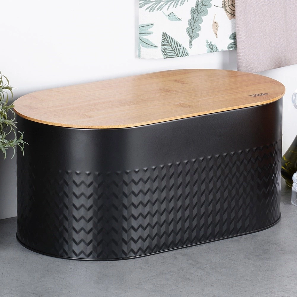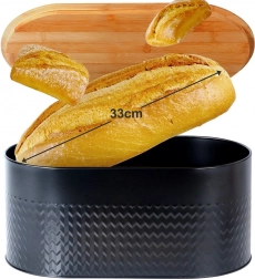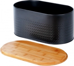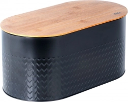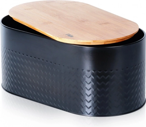 Cutie de pâine modernă cu corp metalic din oțel carbon de calitate, vopsit în negru mat și cu o suprafață texturată de efect. Capacul din lemn natural servește drept tocător practic, astfel aveți mereu totul la îndemână – de la depozitare la servire.
