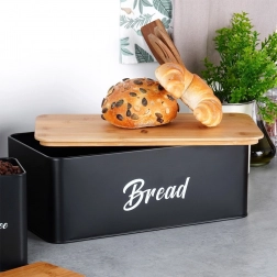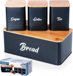 Cutia de pâine din metal rezistent, vopsit în câmp electrostatic, se remarcă prin liniile curate și capacul practic din lemn de bambus, care poate fi folosit ca tocător. Construcția metalică protejează produsele de panificație împotriva deformării și reduce uscarea. Trei recipiente asortate cu capace din bambus păstrează zahărul, cafeaua și ceaiul aromate pentru mai mult timp și depozitate ordonat.
