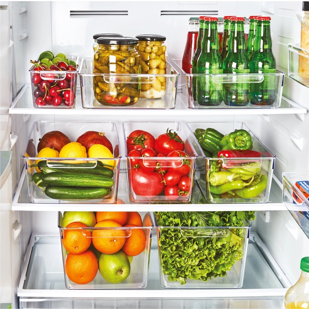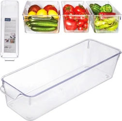 Acest organizer de bucătărie practic, din plastic transparent de calitate, ușurează sortarea și depozitarea alimentelor în frigider și în cămară. Execuția transparentă oferă o vedere imediată asupra conținutului, iar mânerul lateral integrat permite glisarea și transportul facile. Nu are capac, astfel încât aveți acces rapid la alimente.