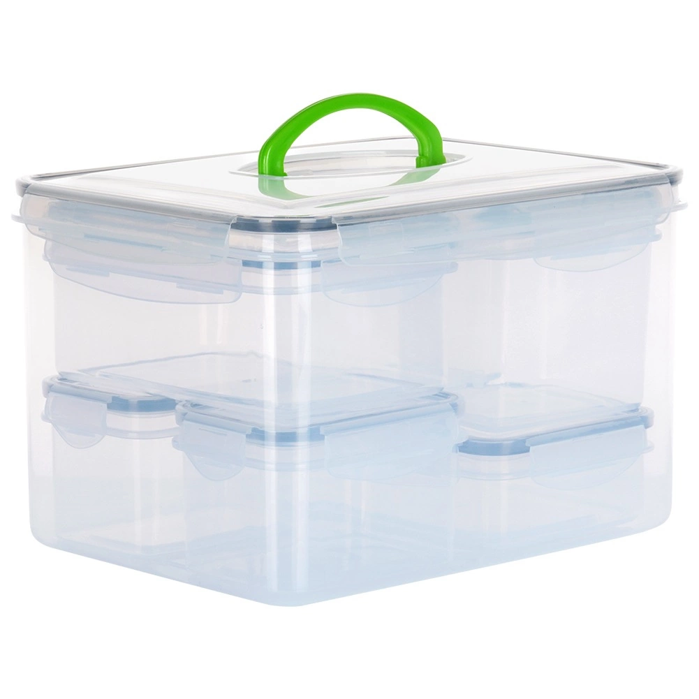 Cea mai mare cutie, cu mâner solid, poate conține toate recipientele mai mici, facilitând transportul și menținându-vă echipamentul bine organizat.