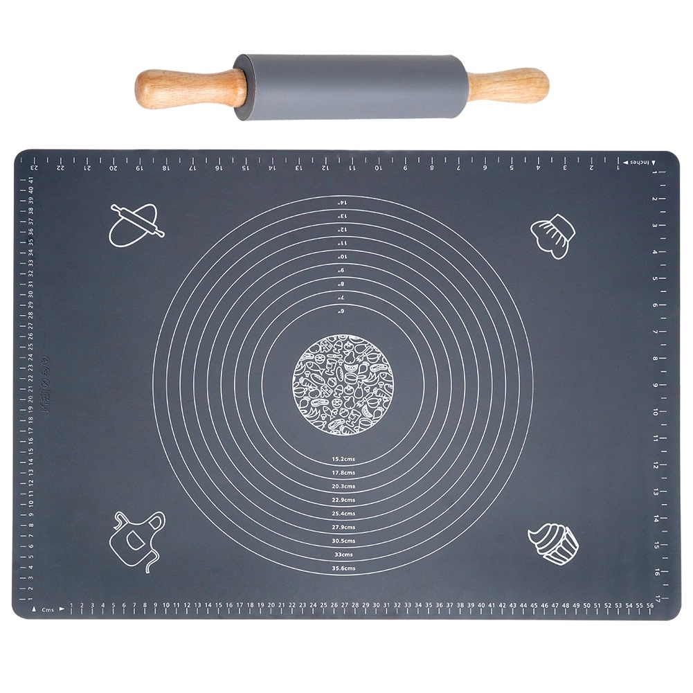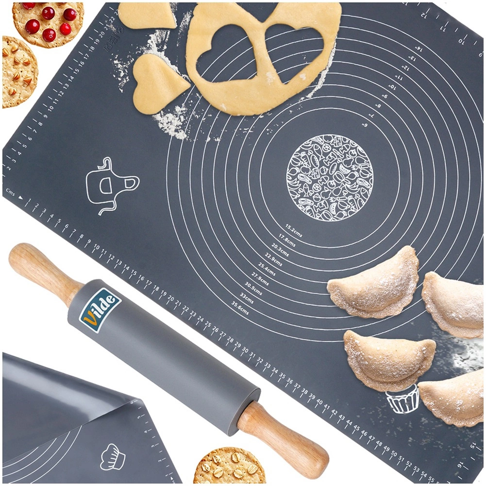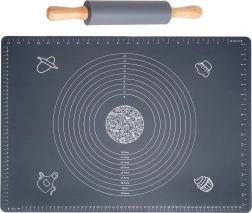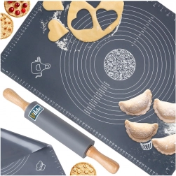 Acest set universal din silicon de calitate, în elegantul gri, este ideal pentru pregătirea aluatului pentru tarte, pizza, biscuiți, paste și găluște. Covorașul este antiaderent și antiderapant, astfel încât stă ferm pe blatul de lucru, iar aluatul nu se lipește. Se curăță ușor, nu absoarbe mirosuri și se usucă rapid.