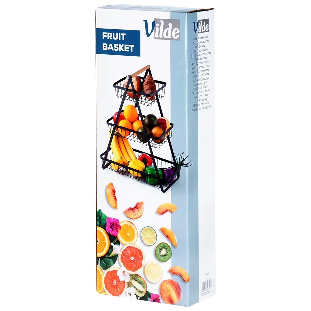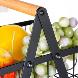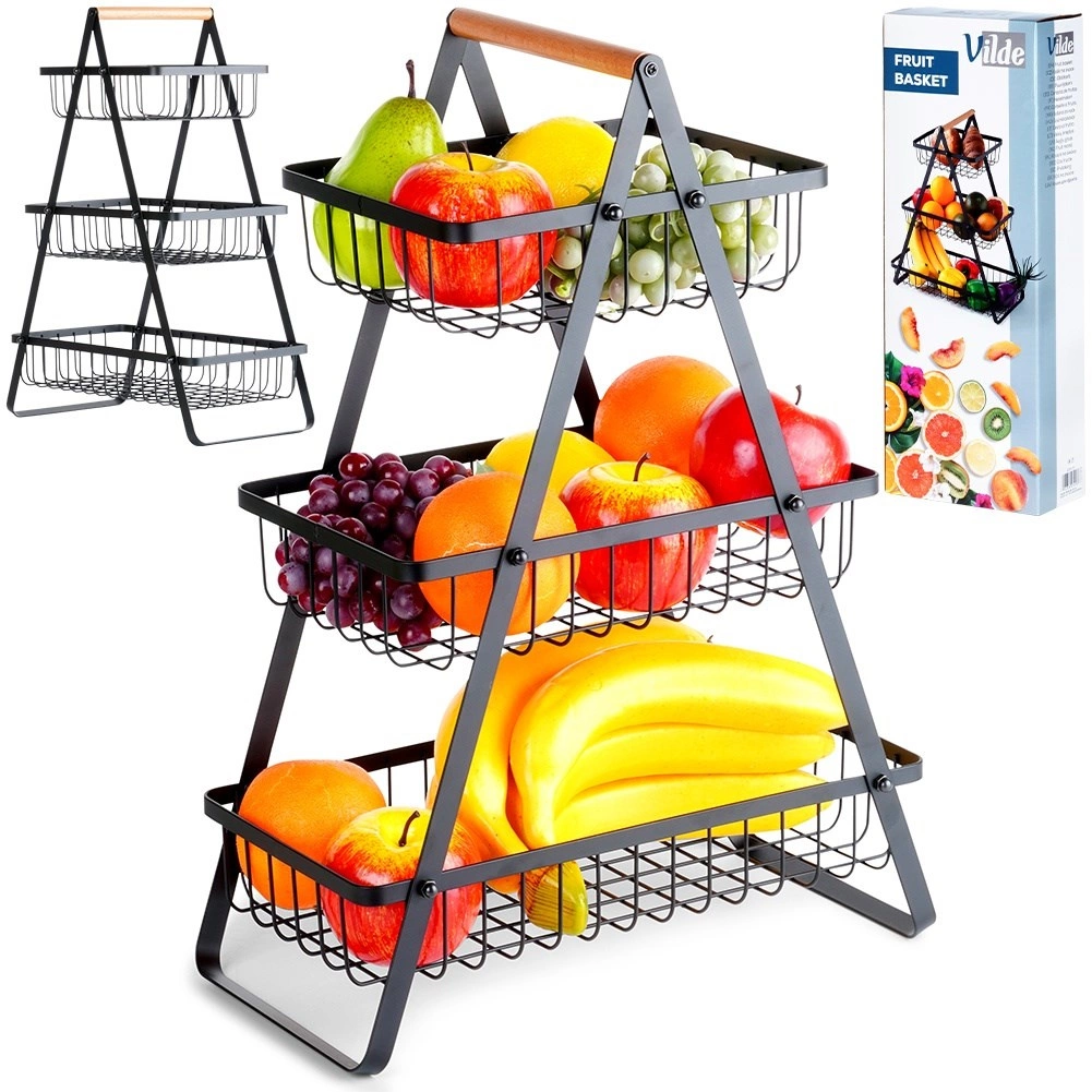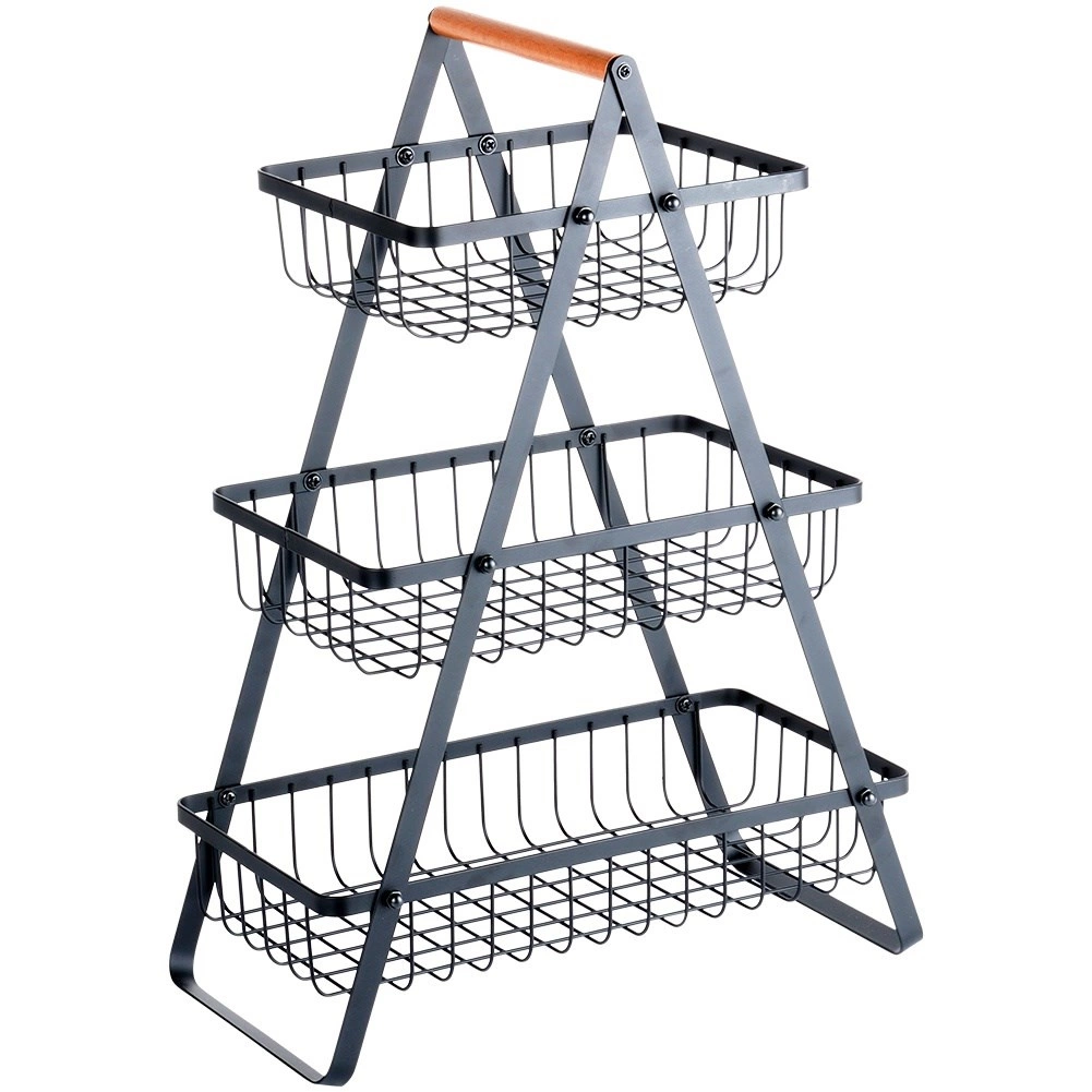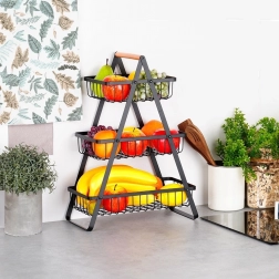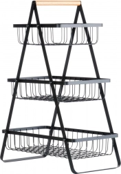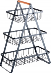 Acest organizator multifuncțional pe trei niveluri este ideal pentru bucătărie și sufragerie. Construcția metalică stabilă, în stil industrial loft, și mânerul din lemn asigură durabilitate și transport comod. Cele trei coșuri de dimensiuni diferite permit depozitarea ordonată a fructelor, legumelor și a mărunțișurilor de uz zilnic.