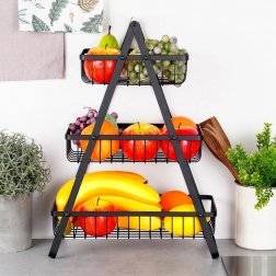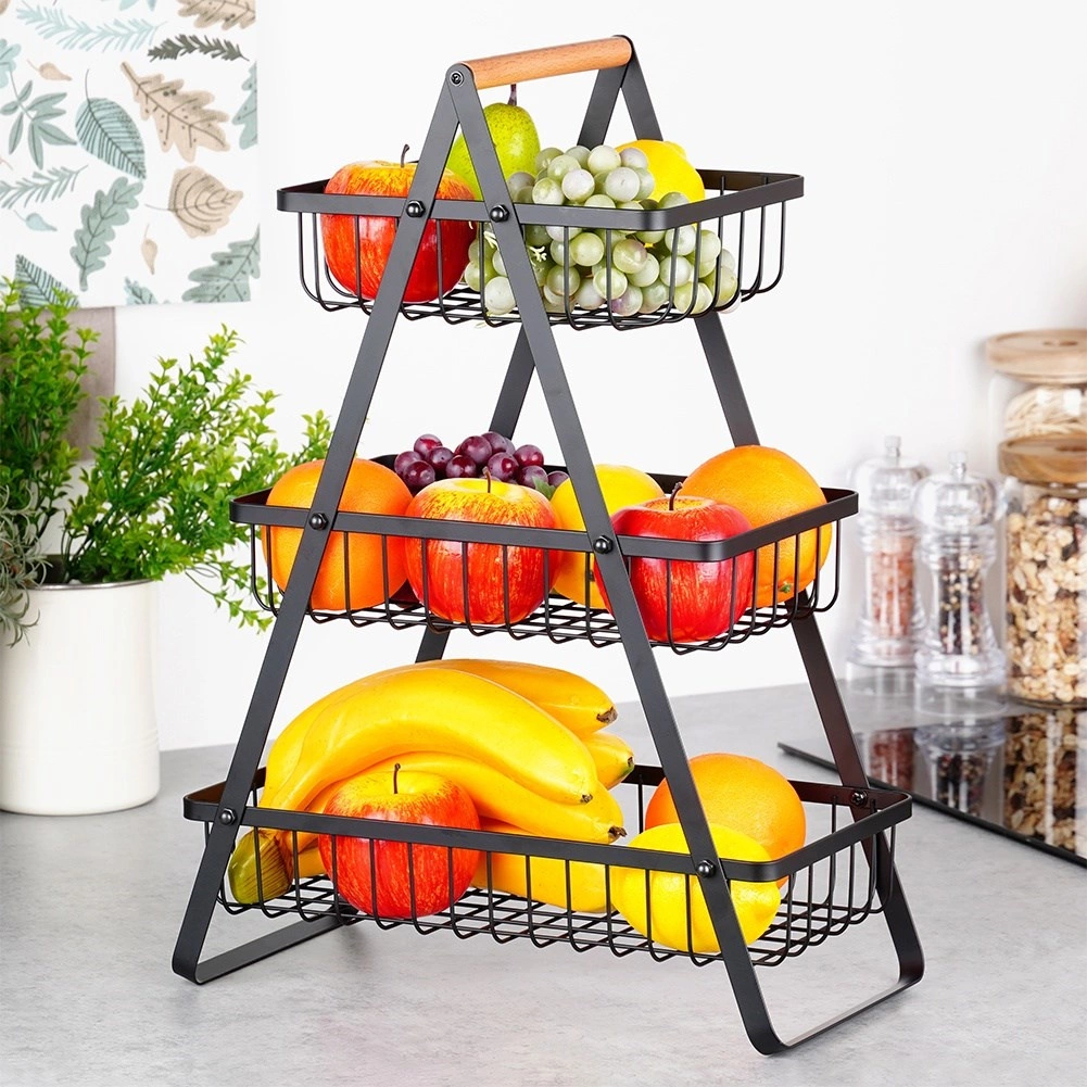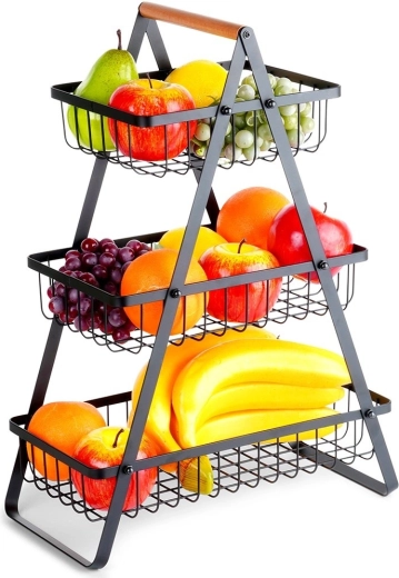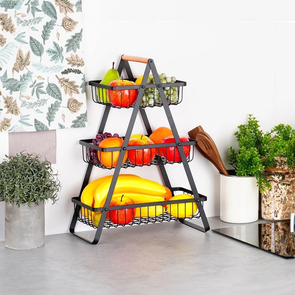 Construcția verticală cu trei coșuri maximizează spațiul de depozitare pe blat și păstrează fructele și legumele ordonate, la îndemână.