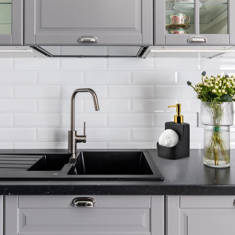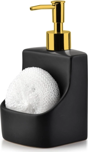 Dozatorul practic pentru detergent de vase combină dispenserul și organizatorul pentru burete într-un singur produs. Datorită buzunarului integrat, accesoriile de curățenie sunt mereu la îndemână, iar suprafața de lucru rămâne curată și ordonată. Ceramica neagră mată cu pompița aurie contrastantă se potrivește perfect bucătăriilor moderne, clasice sau industriale.