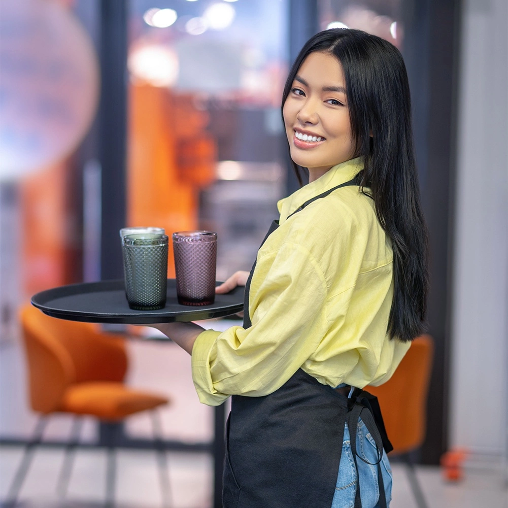 Suprafața texturată menține paharele și farfuriile stabile, chiar și când personalul este în mișcare. Ideală pentru cafenele și restaurante aglomerate.