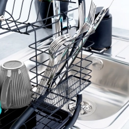 Nivelul superior poate găzdui până la 14 farfurii, iar cel inferior până la 11 farfurii sau alte vase. Include coș detașabil pentru tacâmuri, suport special pentru tocător și mânere pentru transport ușor. Tăvița de scurgere detașabilă simplifică întreținerea și menține blatul uscat.