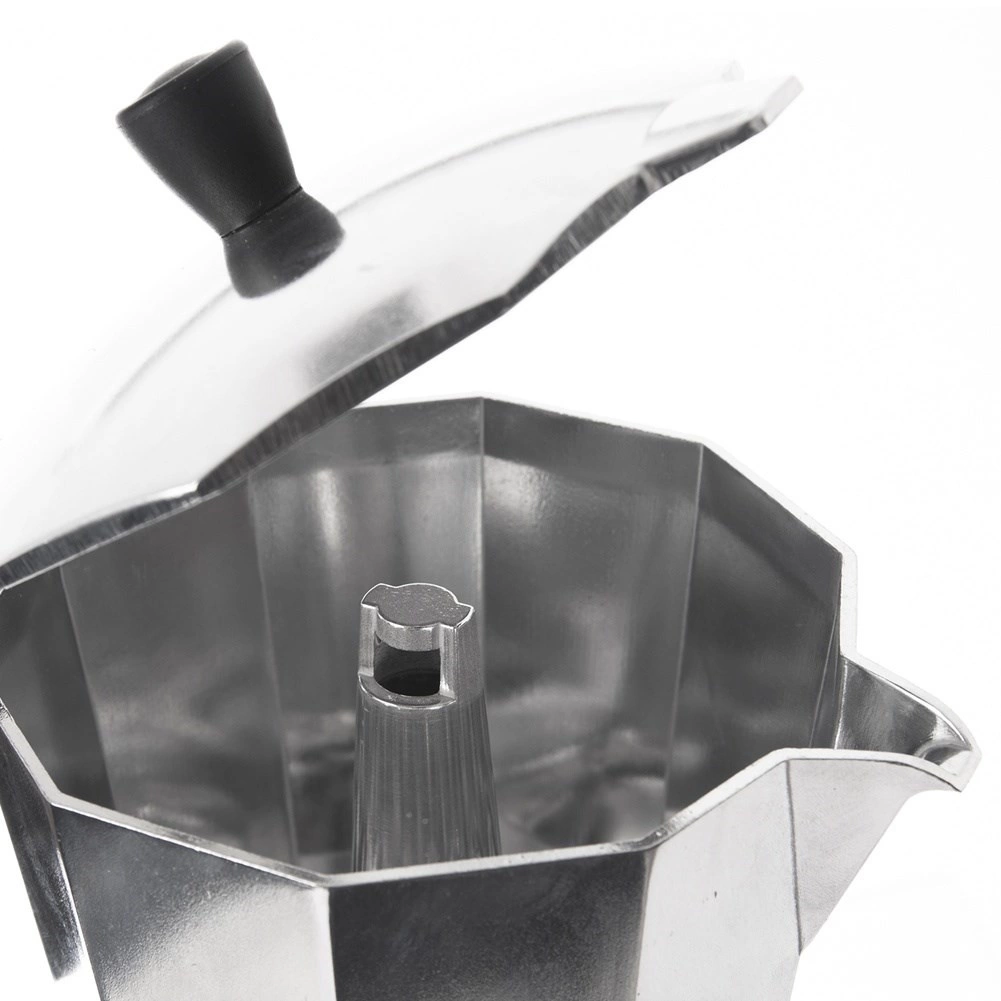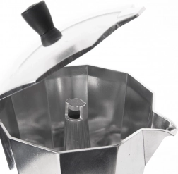 Această elegantă cafetieră moka pregătește până la 9 cești de espresso delicios (aprox. 50 ml per ceașcă), cu gust și aromă pline. Corpul durabil din aluminiu asigură transfer rapid de căldură, iar mânerul ergonomic oferă turnare sigură și comodă. Datorită supapei de siguranță, prepararea cafelei este fiabilă și fără griji.