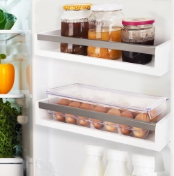 Datorită materialului rezistent, organizatorul este reutilizabil, igienic și ideal ca alternativă la tăvile de carton. Întreținerea ușoară cu apă și burete economisește timp și efort. Potrivit pentru orice frigider și pentru transportul de la cumpărături.