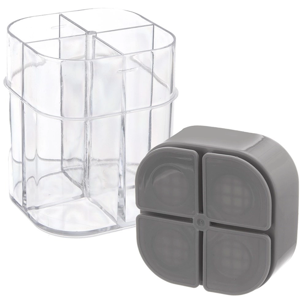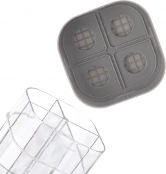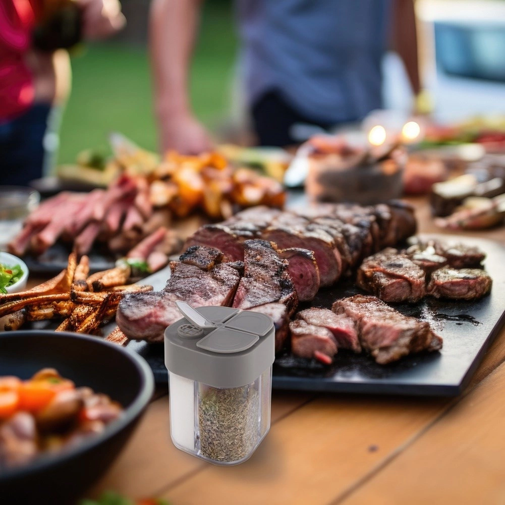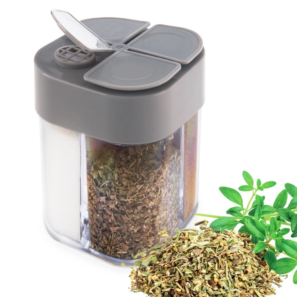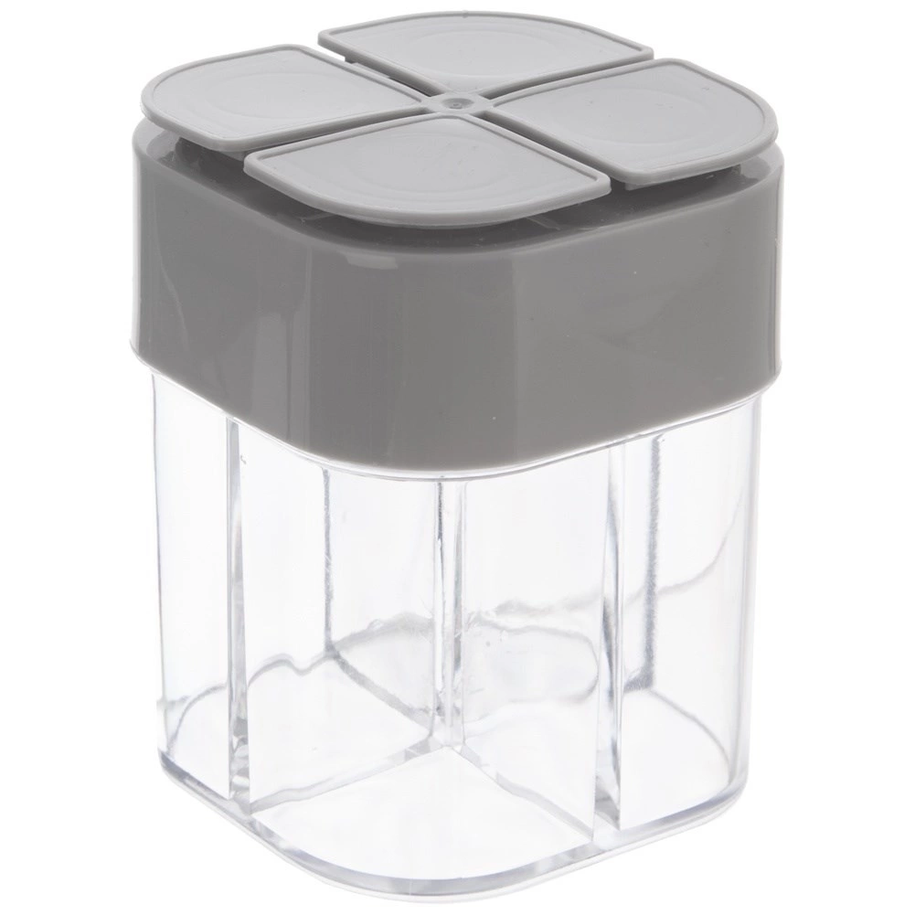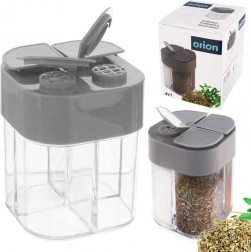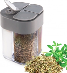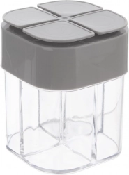 Această doză universală pentru condimente păstrează ordinea și claritatea – într-o singură cutie compactă (6,5 × 8,5 cm) poți depozita comod patru tipuri diferite de condimente. Corpul transparent permite verificarea instantanee a conținutului, iar capacul gri cu orificii multiple asigură dozare precisă în funcție de necesități.