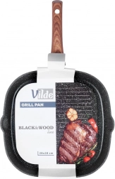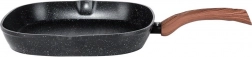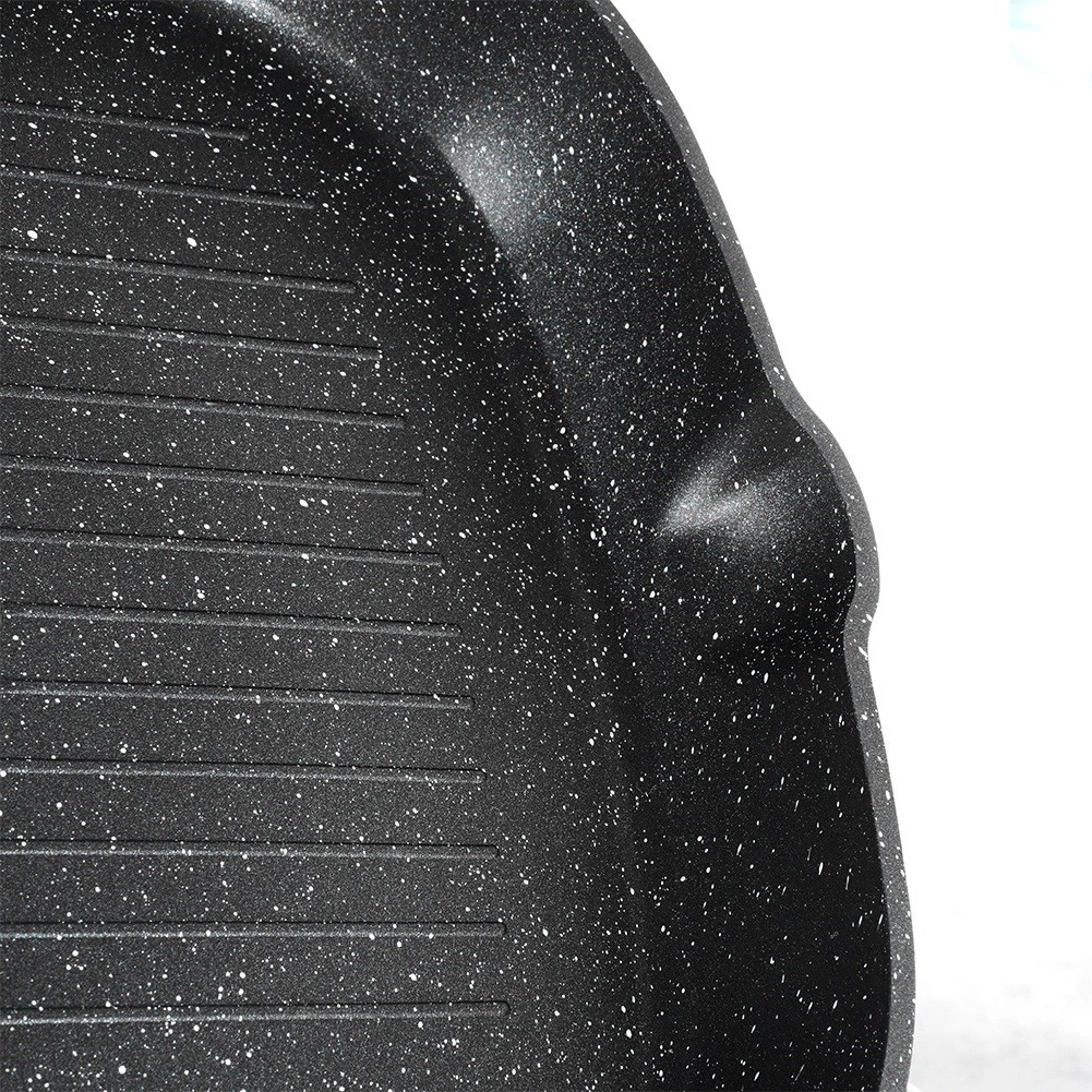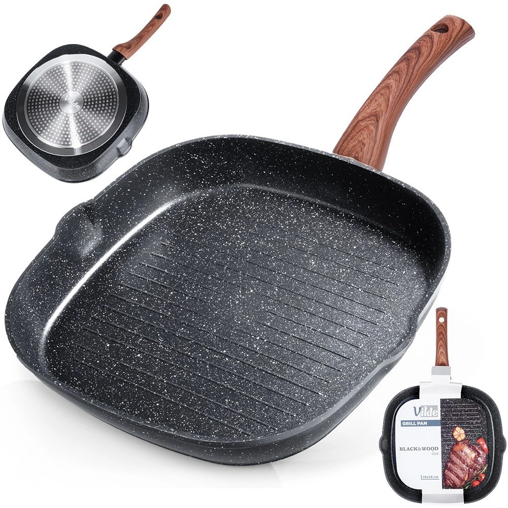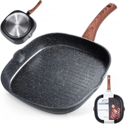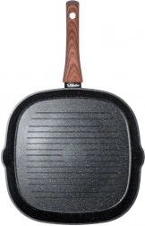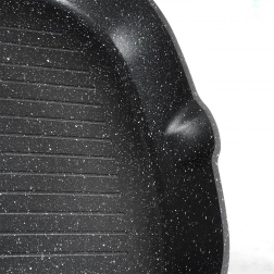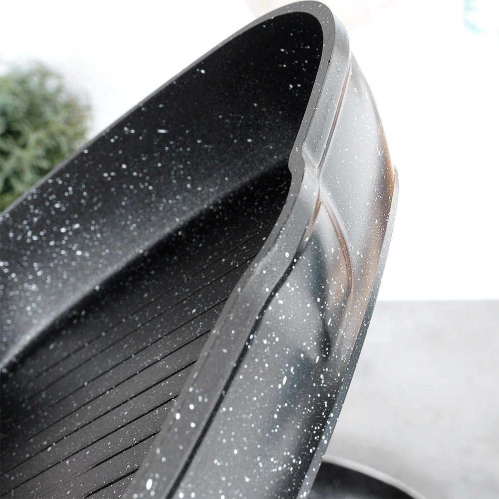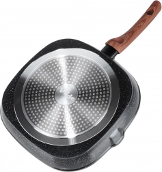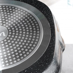 Corpul masiv din aluminiu turnat asigură încălzire rapidă și economică, stratul antiaderent din granit facilitează curățarea și prelungește durata de viață. Două guri de scurgere practice simplifică turnarea sosurilor și sucurilor, mânerul cu aspect de lemn este confortabil, antiderapant și prevăzut cu ochet pentru agățare.