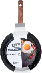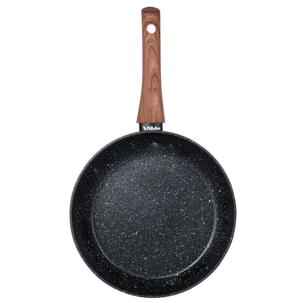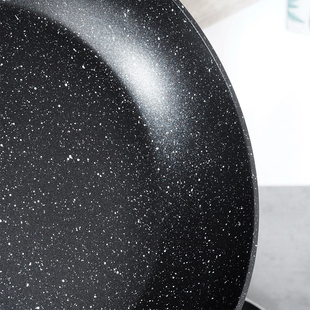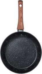 Tigaie universală din granit, diametru 24 cm, cu corp din aluminiu rezistent și suprafață antiaderentă de tip piatră pentru gătit mai sănătos cu minimum de grăsime. Compatibilă cu toate tipurile de plite, inclusiv inducție, potrivită pentru mașina de spălat vase și dotată cu mâner ergonomic, antiderapant cu decor de lemn pentru utilizare sigură și confortabilă.